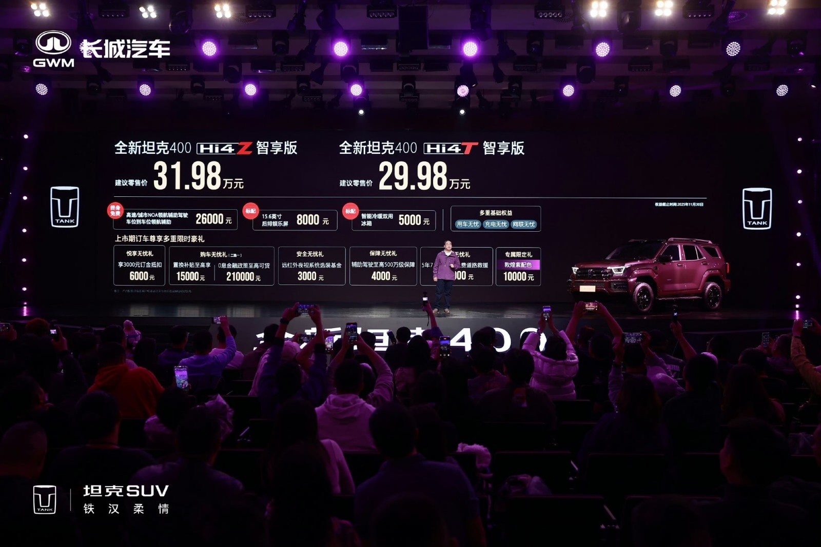 11月6日晚,新款坦克400智驾版正式上市。新车共推出5款车型,售价区间为24.98-31.98万元。其中,汽油版售价为24.98万元,柴油版为26.48万元,Hi4-T标准版为28.58万元,Hi4-T智享版为29.98万元,Hi4-Z智享版为31.98万元。