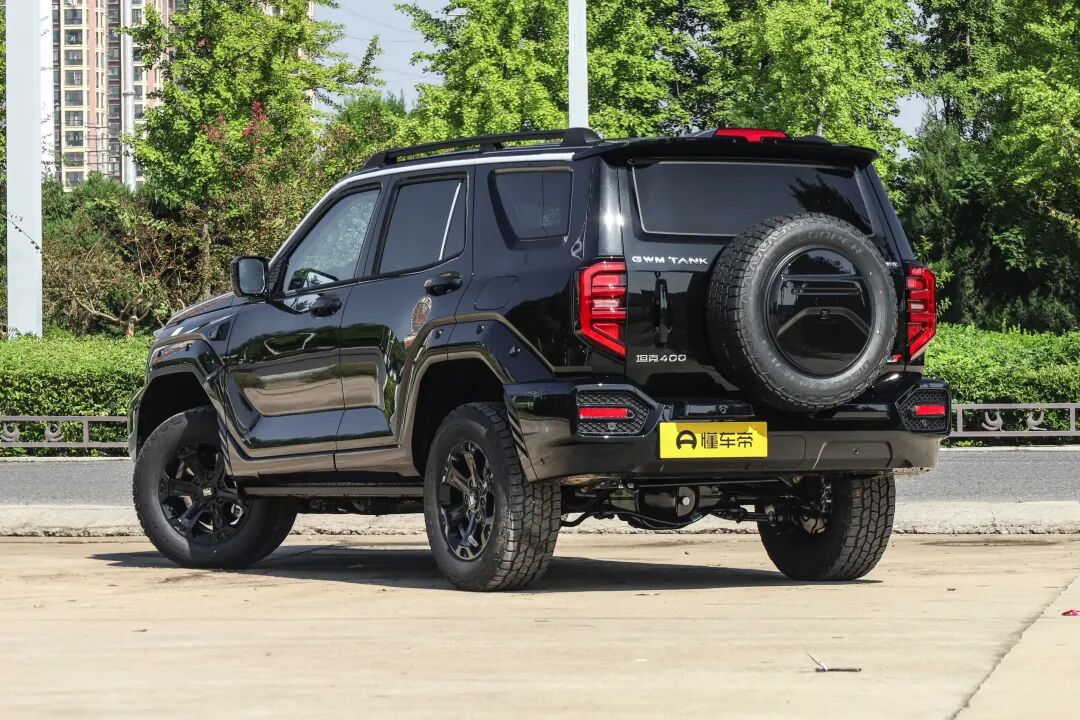 车身侧面和车尾部分,新车基本与现款车型保持一致。车身侧面线条硬朗,采用轮眉外凸且使用铆钉进行装饰,C柱为斜向设计,并配备全新的黑化风格轮圈,整体越野车气息浓郁。尺寸方面,新车长宽高分别为4964/1970/1905mm,轴距为2850mm。车尾部分,新车尾灯组采用垂直竖向排列布局,LED光源相当吸睛,点亮后具有不错的辨识度,并继续提供外挂式备胎,但取消了备胎围挡,取而代之的是坦克300相同的备胎罩。除此之外,新车还新增了辅助驾驶小蓝灯,后包围部分与前包围保持一致进行重新设计,尾标布局也有所变化,上方分别带有“GWM TANK”和“长城汽车”标识,下方则带有“坦克400”以及动力标识,进一步提升了车辆辨识度。