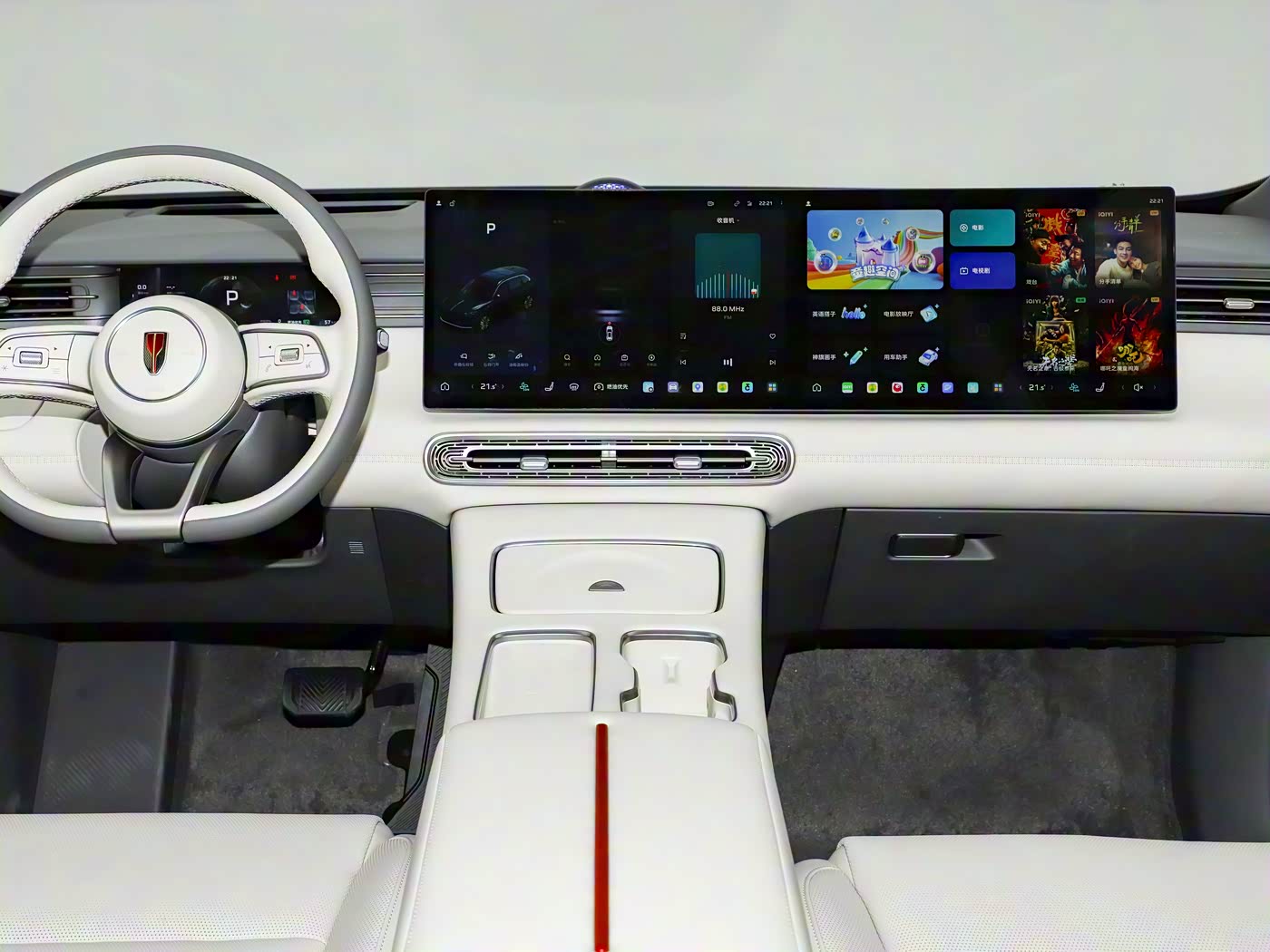 内饰方面,相比在售红旗新能源车型,红旗HS6 PHEV首次使用副驾双连屏设计,同步提供小尺寸液晶仪表盘和抬头显示系统。细节上,红旗HS6中控台为阶梯式设计,部分区域提供皮质包裹和缝线工艺,整体运用无实体按键的简约化风格,并在驾驶员侧设计有带盖板的小型储物槽。红旗HS6 PHEV采用三辐式造型和双拼皮质包裹,具有按压+滚轮的实体多功能按键。由于采用怀挡式设计,该车副仪表台区域可提供单手机无线充电板、双杯架和带有盖板的储物槽,副仪表台下部设计有掏空式储物空间。