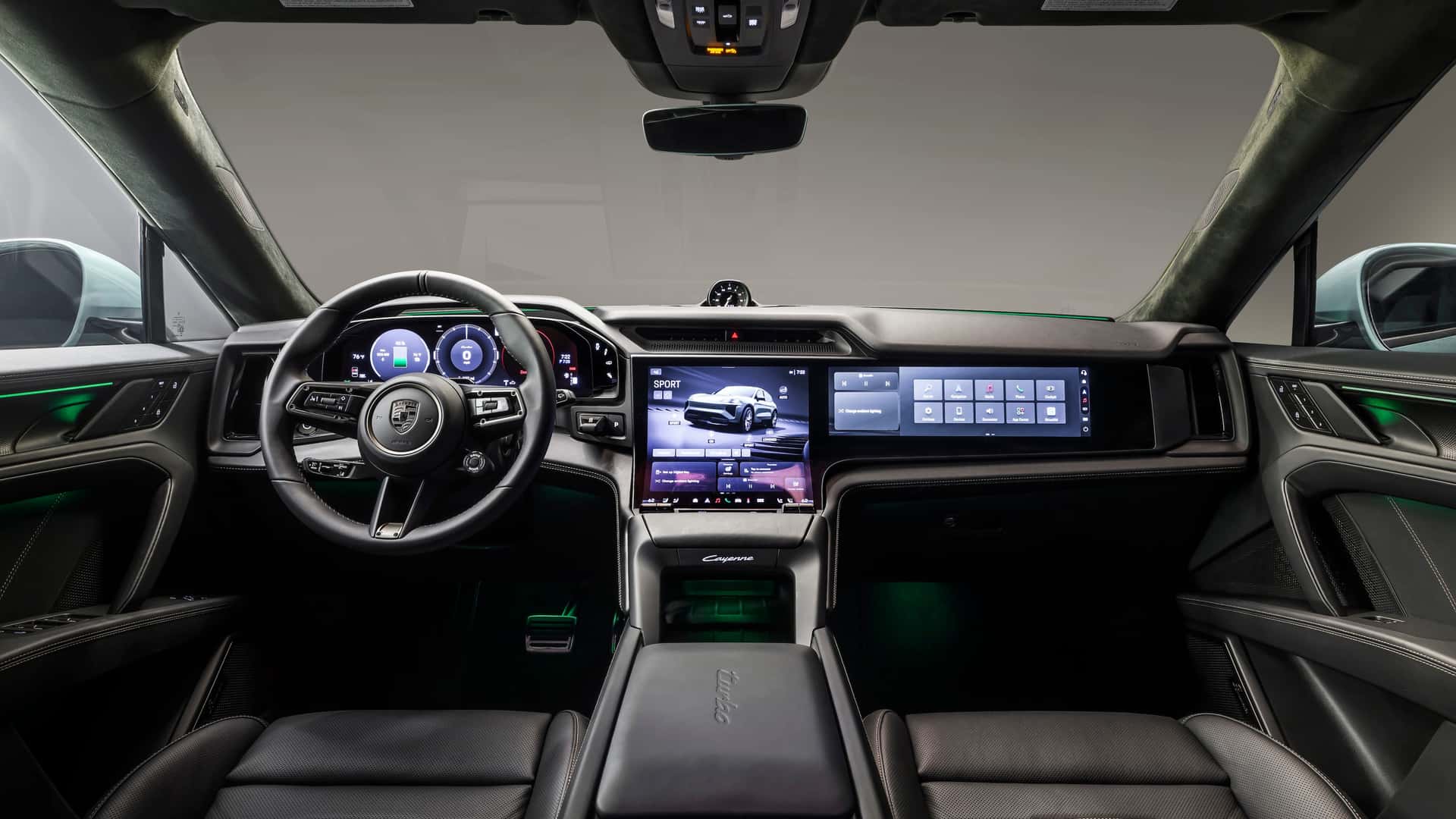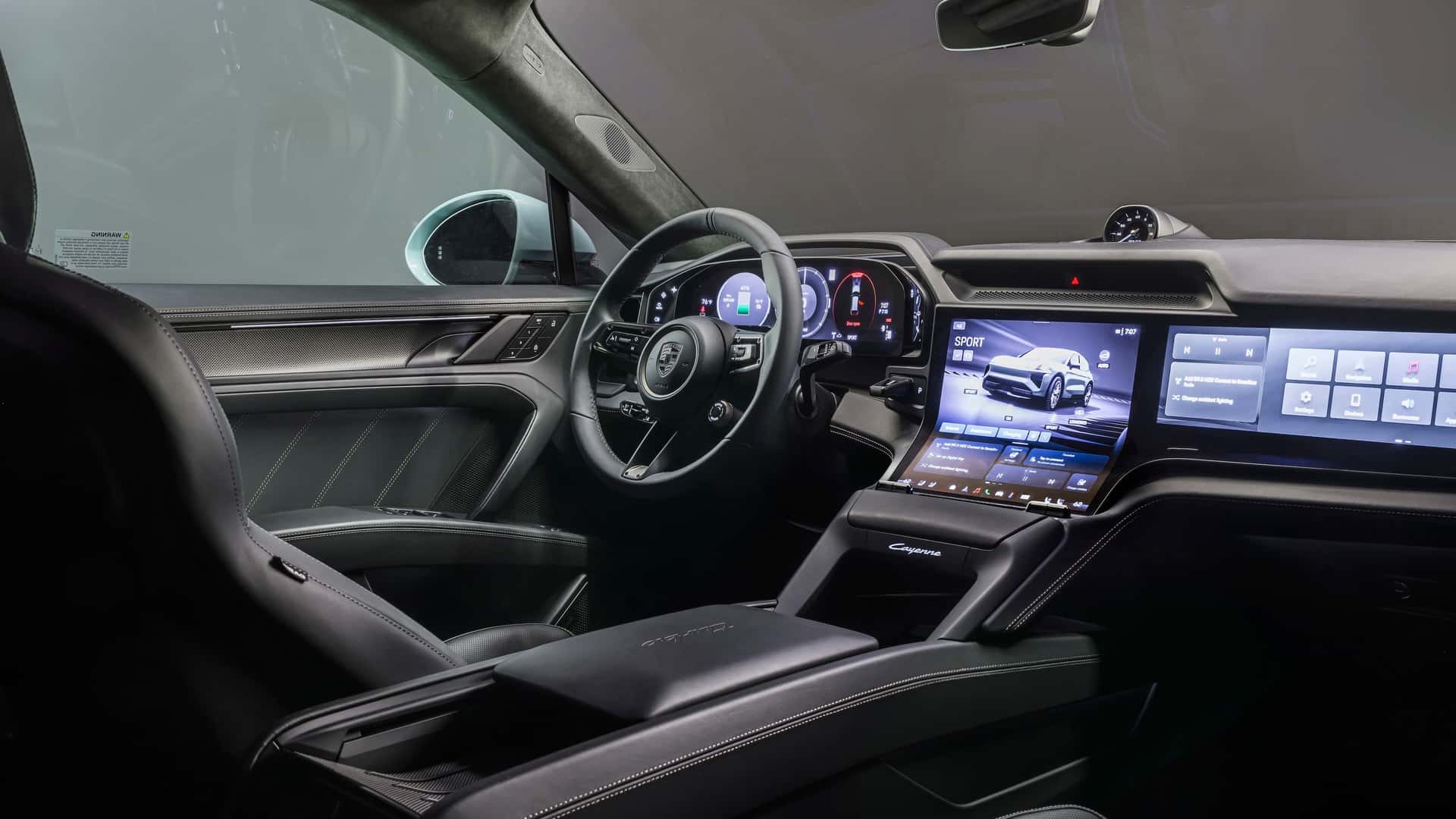内饰方面,全新保时捷Cayenne Electric内饰采用最新布局风格,提供13种内饰颜色组合、4种内饰套件以及5种装饰套件等可选,并提供情绪模式,可以根据驾驶员的喜好调节照明、空调、音响和座椅等。此外,全新保时捷Cayenne Electric真皮材质提供镁灰色、薰衣草紫色和鼠尾草灰色三种颜色可选。新车配备12.25英寸Flow Display曲面屏、14.25英寸OLED全数字仪表盘、87英寸AR-HUD抬头显示(选装)以及14.9英寸副驾驶屏幕(选装),整体布局构成了全新研发的保时捷驾驶体验系统(Porsche Driver Experience)。