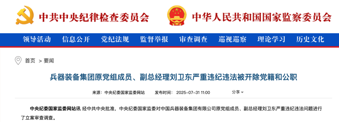 早在今年2月,中央纪委国家监委网站发布消息称,中国兵器装备集团有限公司党组成员、副总经理刘卫东涉嫌严重违纪违法,目前正接受中央纪委国家监委纪律审查和监察调查。到了7月,中央纪委国家监委通报,刘卫东严重违纪违法被开除党籍和公职:经中共中央批准,中央纪委国家监委对中国兵器装备集团有限公司原党组成员、副总经理刘卫东严重违纪违法问题进行了立案审查调查。