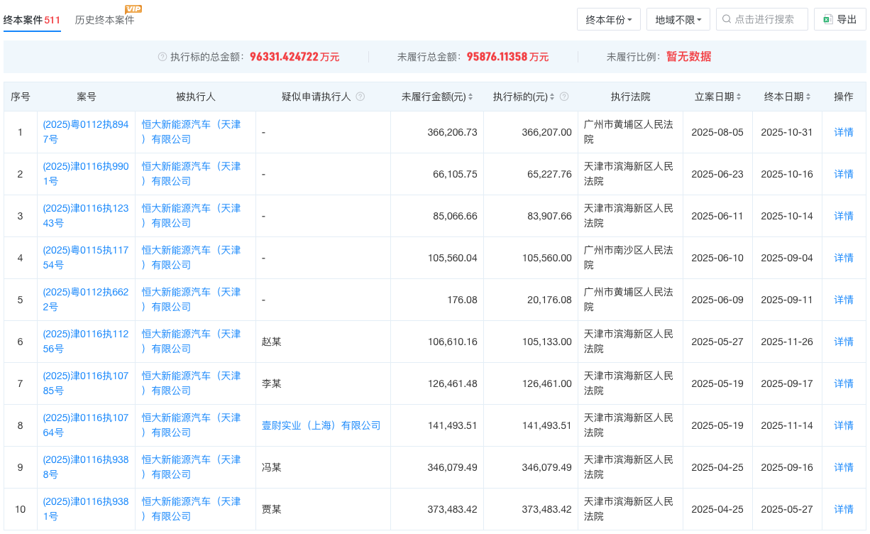 据公告了解,上海鑫燕隆汽车装备制造有限公司与恒大新能源汽车(天津)有限公司买卖合同纠纷一案,法院于2022年11月29日作出判决,判令恒大新能源汽车(天津)有限公司支付上海鑫燕隆汽车装备制造有限公司货款9,541,032.28元,并判决恒大新能源汽车(天津)有限公司负担诉讼费用39,117元。判决生效后,恒大新能源汽车(天津)有限公司未在判决确定的期限内履行给付义务,上海鑫燕隆汽车装备制造有限公司向本院申请强制执行,恒大新能源汽车(天津)有限公司暂无可供执行的财产,本院于2023年9月5日作出裁定终结本次执行程序。恒大新能源汽车(天津)有限公司称,公司已于2024年1月初停产,并提供公司资产负债表。资产负债表显示,截至2025年9月30日,恒大新能源汽车(天津)有限公司资产总计3,577,227,734.41元,负债总计7,687,175,268.34元,所有者权益合计-4,109,947,533.93元,故法院受理上海鑫燕隆汽车装备制造有限公司对恒大新能源汽车(天津)有限公司的破产清算申请。