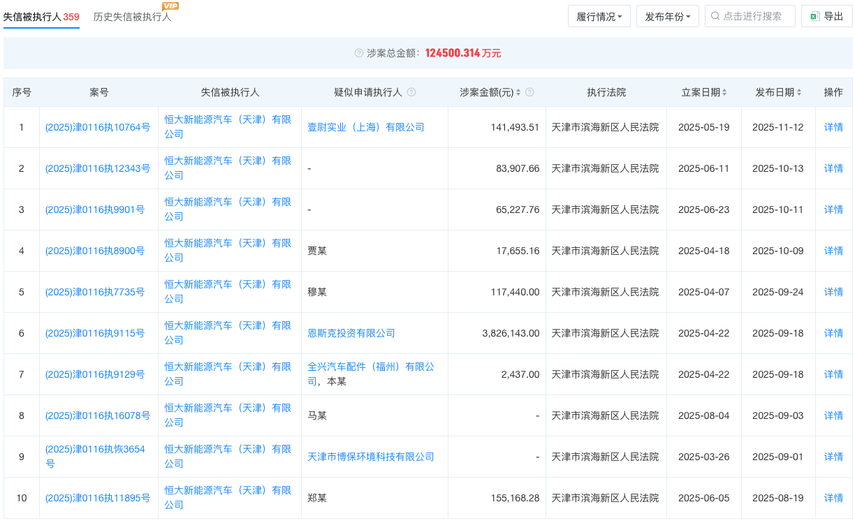 此前因不能清偿到期债务且明显缺乏清偿能力,上海鑫燕隆汽车装备制造有限公司向法院申请对恒大新能源汽车(天津)有限公司进行了破产清算,天津市滨海新区人民法院于11月4日通知恒大新能源汽车(天津)有限公司。随后的11月12日,天津市滨海新区人民法院公告,法院依据上海鑫燕隆汽车装备制造有限公司的申请于2025年11月12日裁定受理恒大新能源汽车(天津)有限公司破产清算一案,并于2025年11月12日指定恒大新能源汽车(天津)有限公司清算组为恒大新能源汽车(天津)有限公司管理人。次日,恒大汽车表示法院已受理债权人对公司之间接全资附属公司恒大新能源汽车(天津)有限公司的破产以及清算呈请。