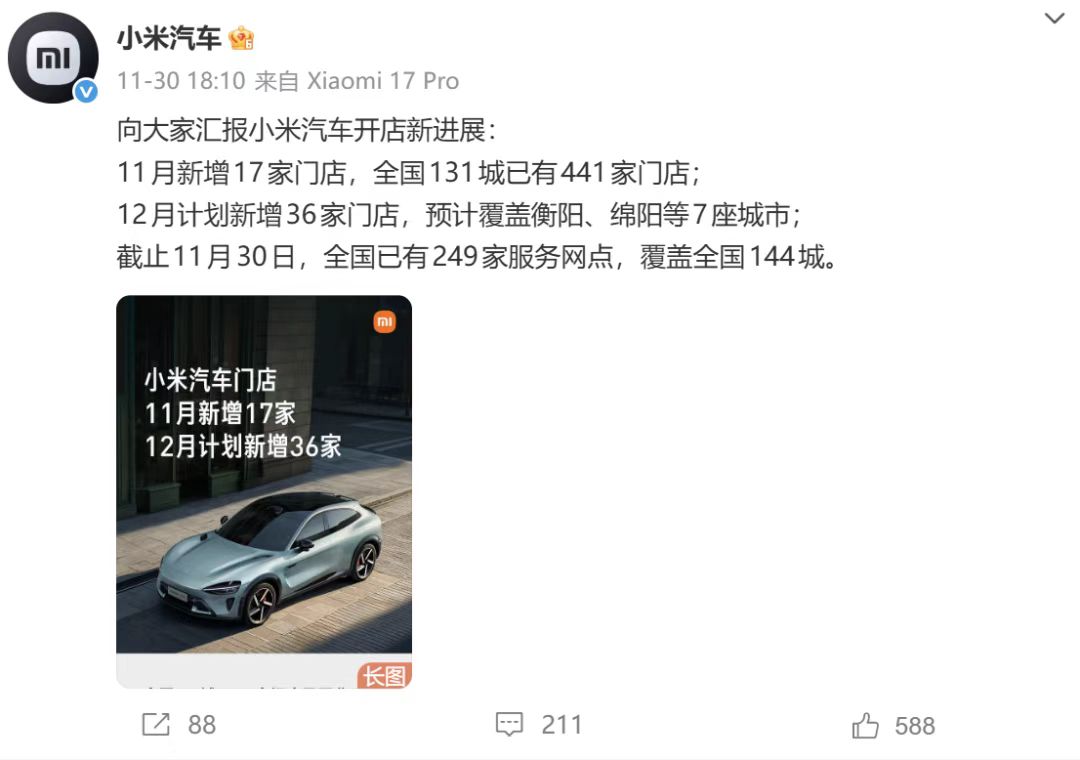 业内人士表示,此次小米给全国汽车经销商发放超一亿元红包补助的背景是小米汽车渠道的快速扩张。11月30日,小米汽车宣布,截至11月底,小米汽车全国131城已有441家门店;全国已有249家服务网点,覆盖全国144城。其中,近三个月小米汽车门店数量持续增多,9月至11月小米汽车门店分别新增32家、22家、17家,累计新增71家门店。小米汽车表示,预计12月还将新增36家门店,预计覆盖衡阳、绵阳、安阳、上饶、荆州、枣庄和运城共7座城市。