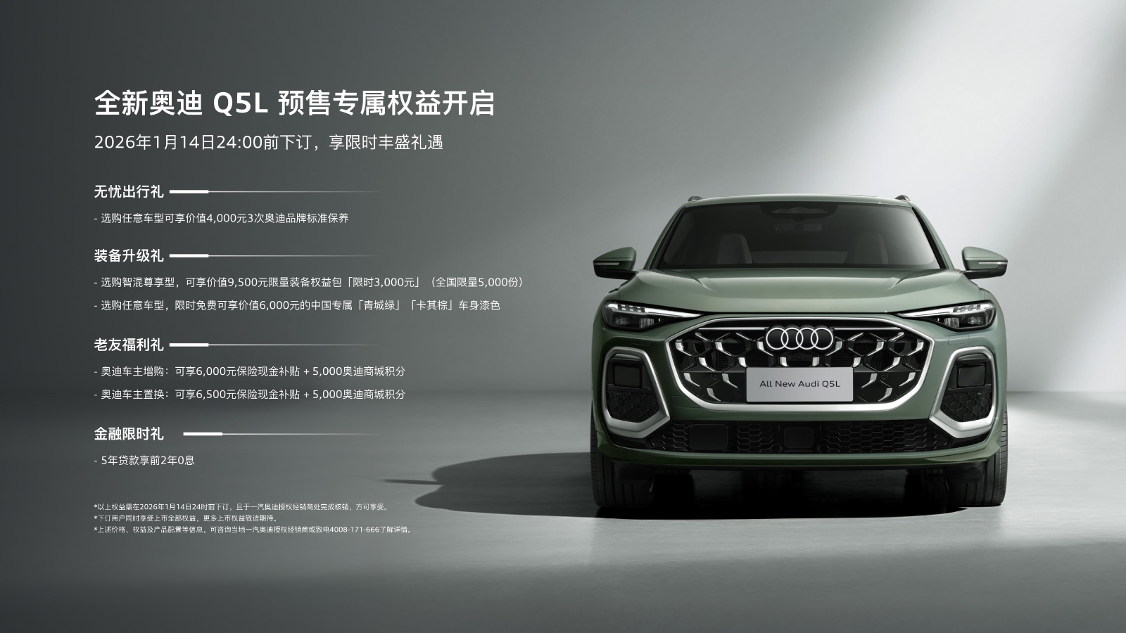 12月20日,《汽车行业关注》从一汽奥迪官网了解,一汽奥迪旗下全新奥迪Q5L现已开启预售。新车推出智混豪华型、千万用户专享版、智混尊享型、智混旗舰型共4款车型,预售价区间为31.30-38.50万元,