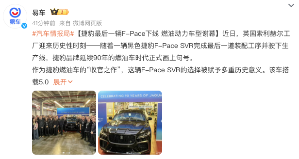 据多家媒体报道,英国豪华汽车制造商捷豹品牌最后一辆燃油车型——F-PACE SVR已在12月19日位于英国索利赫尔工厂下线,标志F-PACE SVR车型正式谢幕。需注意的是,该车也是捷豹生产的最后一款燃油车车型,这也意味着捷豹燃油车时代的结束。