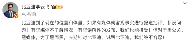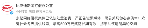 李云飞表示:“比亚迪到了现在的位置和体量,如果有媒体就客观事实进行报道批评,都没问题!有些媒体不了解情况,有些误解性的发布,我们也能接受!但对于黑公关、黑媒体,为了黑而黑,长期针对比亚迪,诋毁比亚迪,我们绝不容忍!”此外,比亚迪新闻打假办公室也表示,多起网络侵权案件已依法处置追责,严正告诫黑媒体、黑公关切勿心存侥幸!并表示,欢迎社会各界提供线索,最高500万元奖励长期有效,携手共筑清朗舆论空间。