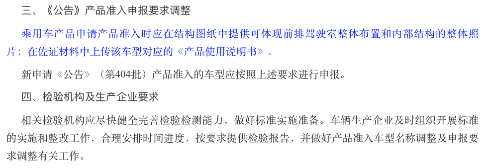 12月26日,工业和信息化部装备工业发展中心发布《关于〈公告〉标准实施及产品准入相关要求调整的通知》。其中,在产品准入申报要求调整中提及,从明年第404批《道路机动车辆生产企业及产品公告》新产品公示列