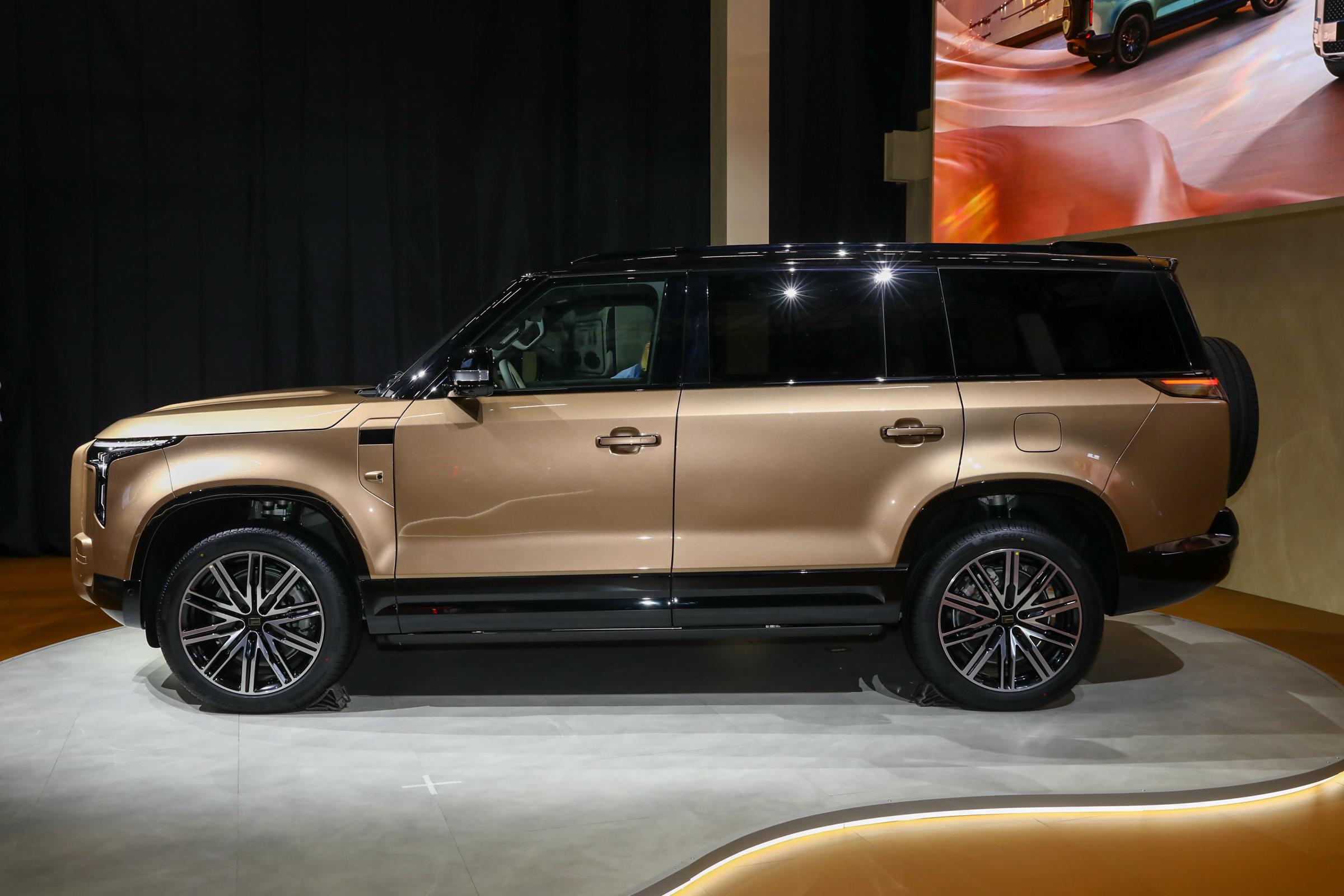 车身侧面,新车线条硬朗,一条笔直的腰线从车头一直延伸至车尾,使得车辆看起来力量感十足。车顶采用双色和平直造型设计,搭配前后侧翼子板微微突出车身以及常规造型车门把手和外挂式备胎,令车辆更显肌肉感和运动属性。车身颜色方面,新车提供深岩灰、冰川白、林野绿、流沙金和星曜黑共计5种颜色供消费者选择。尺寸方面,新车长宽高分别为5050(5298)/1985/1869(1856)mm,轴距为3010mm,定位中大型SUV。车尾部分,新车尾灯设计风格与前脸保持一致,采用类似字母“Y”字形的尾灯组设计,大量平直的线条搭载配备造型夸张的外挂式备胎布局,使得车辆看起来相当硬朗。