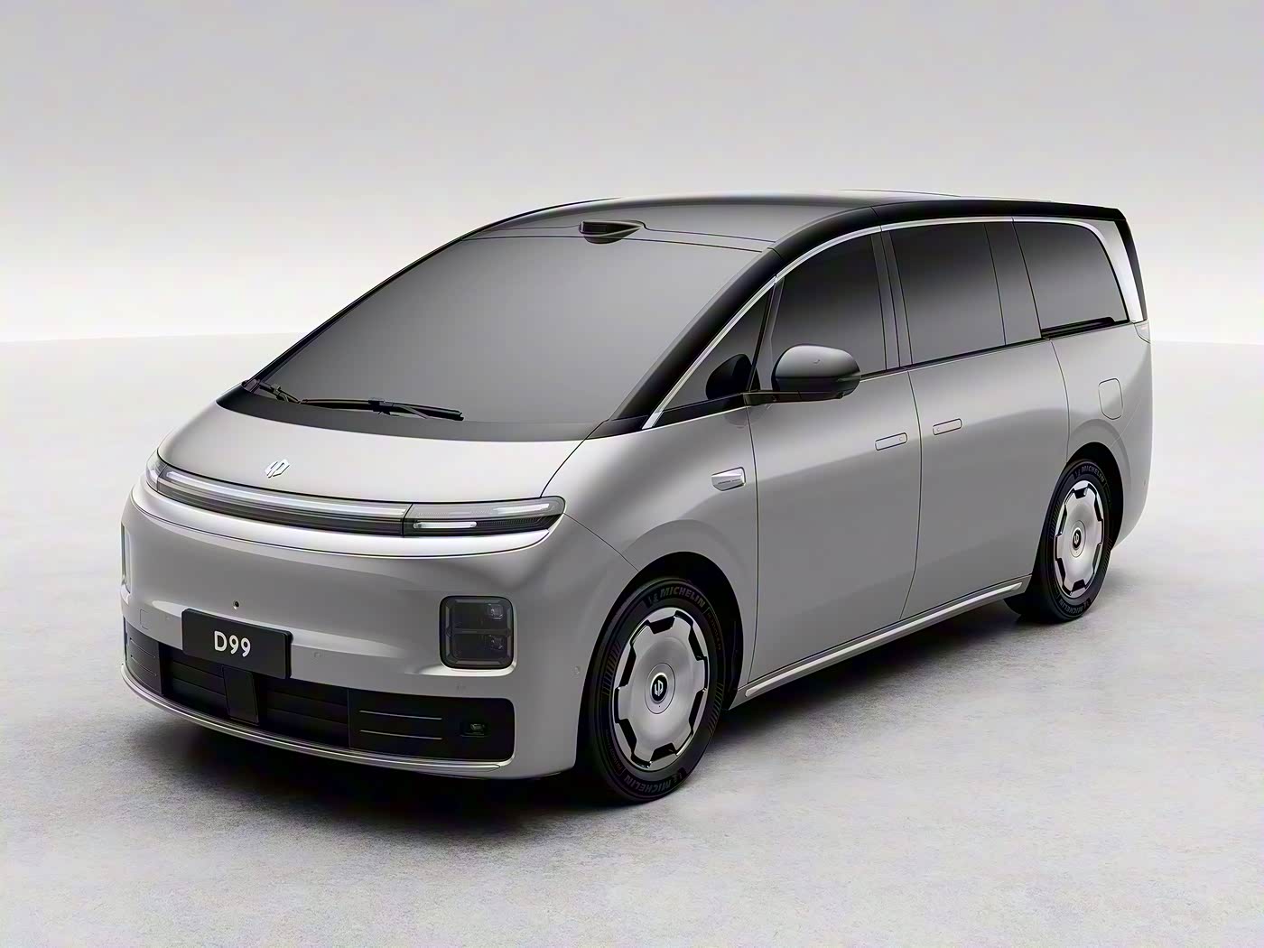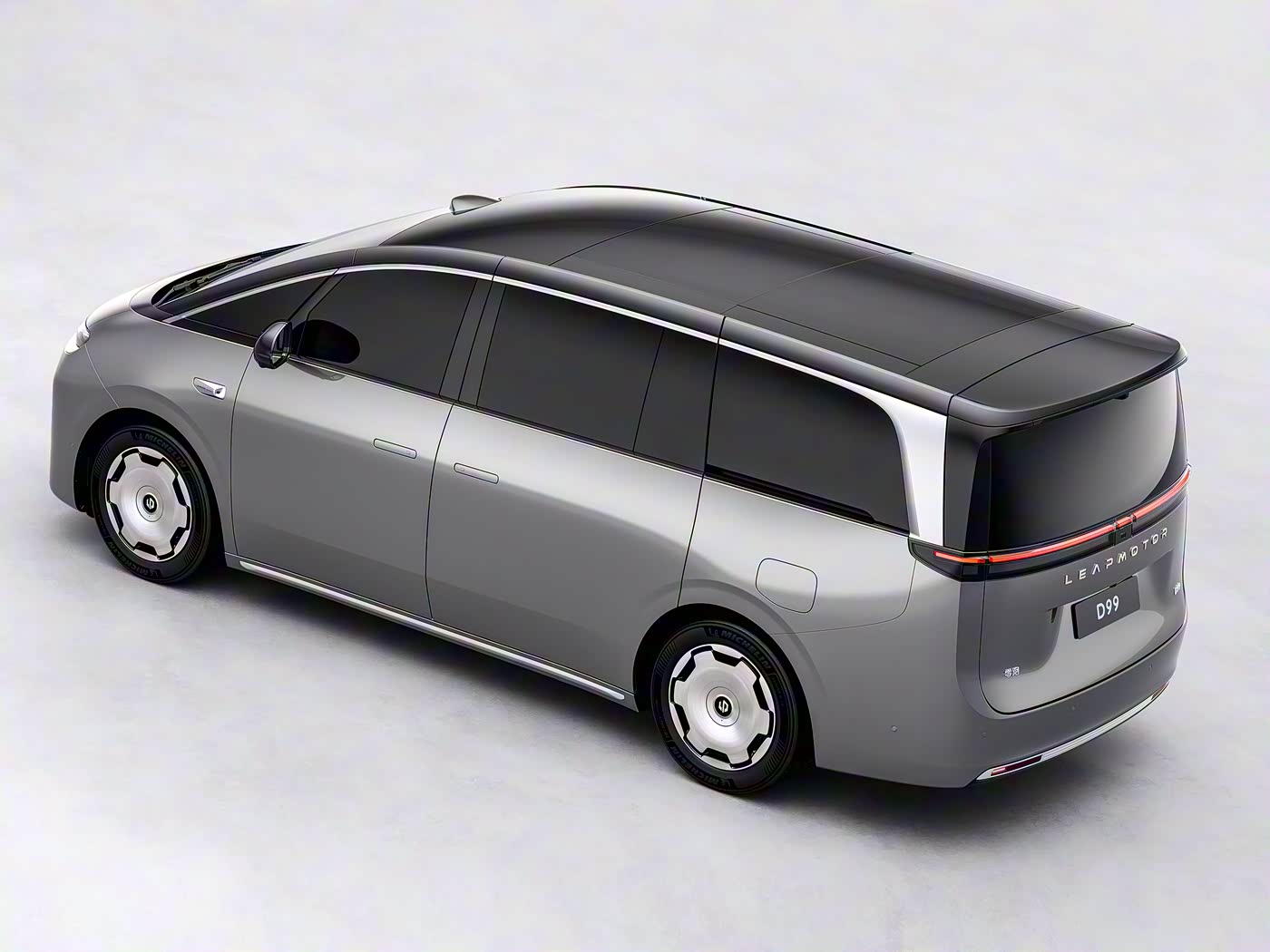 车身侧面,零跑D99采用短前悬,但拥有较长的后悬与轴距,银色的装饰勾勒出新车车窗的线条,后排侧滑门尺寸更大,上下车更加方便,同时采用隐藏式滑轨设计。新车配备19英寸的“向往之境”饼型轮圈及米其林静音轮胎。尺寸方面,新车的车身长度超5.2米,车宽接近2米,而轴距则是超过3.1米,具体的车身数据尚未公布。车尾方面,零跑D99在D柱位置设计有哑光饰板,尾灯则应用时下流行的贯穿式设计,灯组内部还集成有ISD交互灯幕,支持多种灯语。后包围底部配有贯穿式的哑光银色饰条,与前脸的设计语言形成呼应。