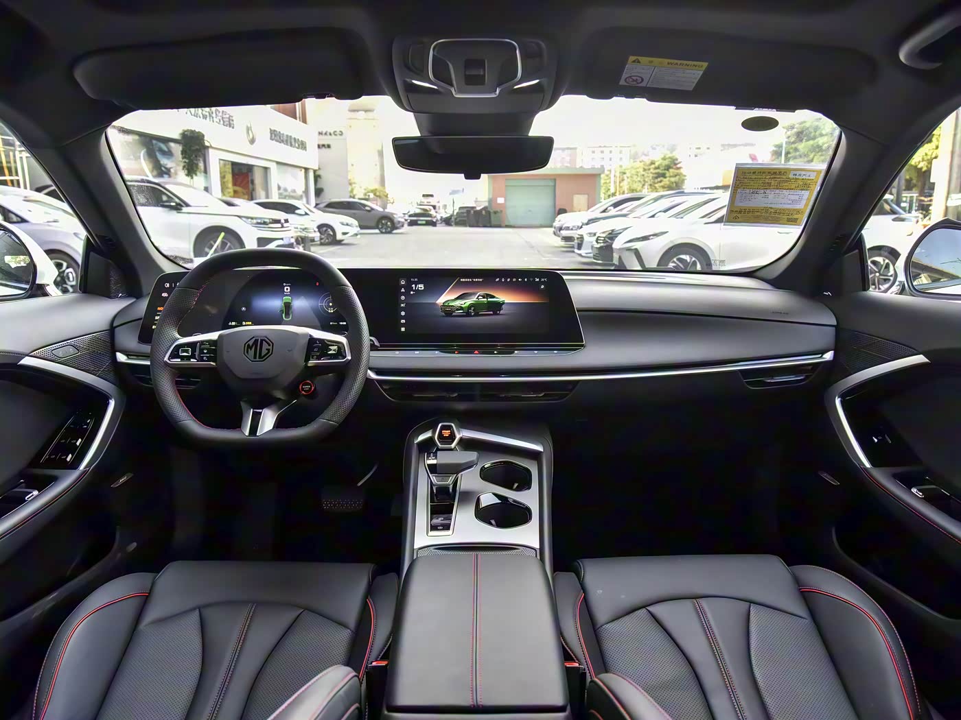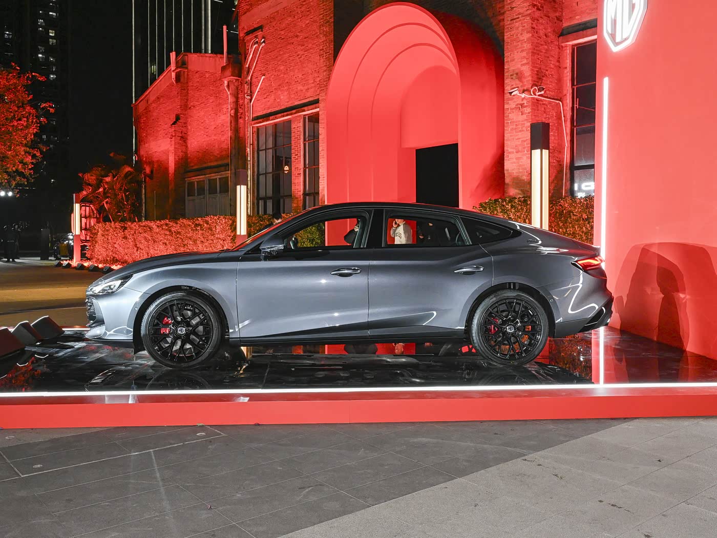 车身侧面,车顶线条从A柱末端一直延伸到车尾,形成溜背式造型。双段式腰线设计的后腰线将后翼子板的宽体造型进行放大,再配合无框车门,运动感十足。车尾部分,新车继续采用贯穿式尾灯造型,配备三段式主动电动尾翼,采用四出尾排设计,配合底部大面积扰流器,进一步彰显运动属性。尺寸方面,新款MG7长宽高分别为4884/1889/1447mm,轴距为2778mm,定位A+级轿跑。