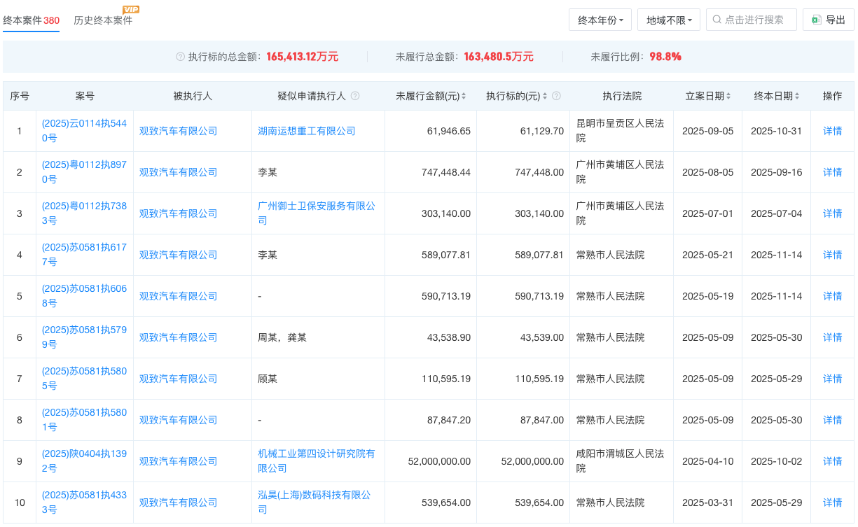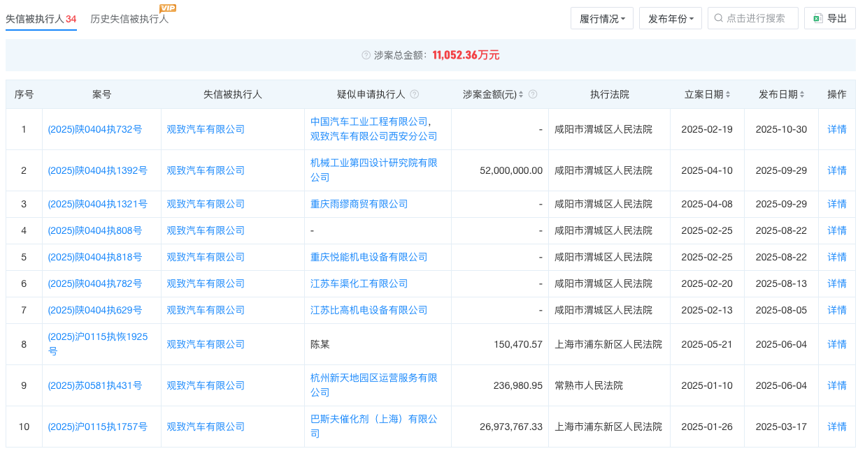 天眼查风险信息显示,截至发稿前,观致汽车有限公司存在多条被执行人、限制消费令、失信被执行人信息。其中,终本案件380条,执行标的总金额为165413.12万元;失信被执行人34条,涉案总金额为11052.36万元;被执行人39条,被执行总金额为76853.67万元,其中最新一条为今年1月4日新增,执行标的为872.50万余元,执行法院为咸阳市渭城区人民法院;股权冻结31条。