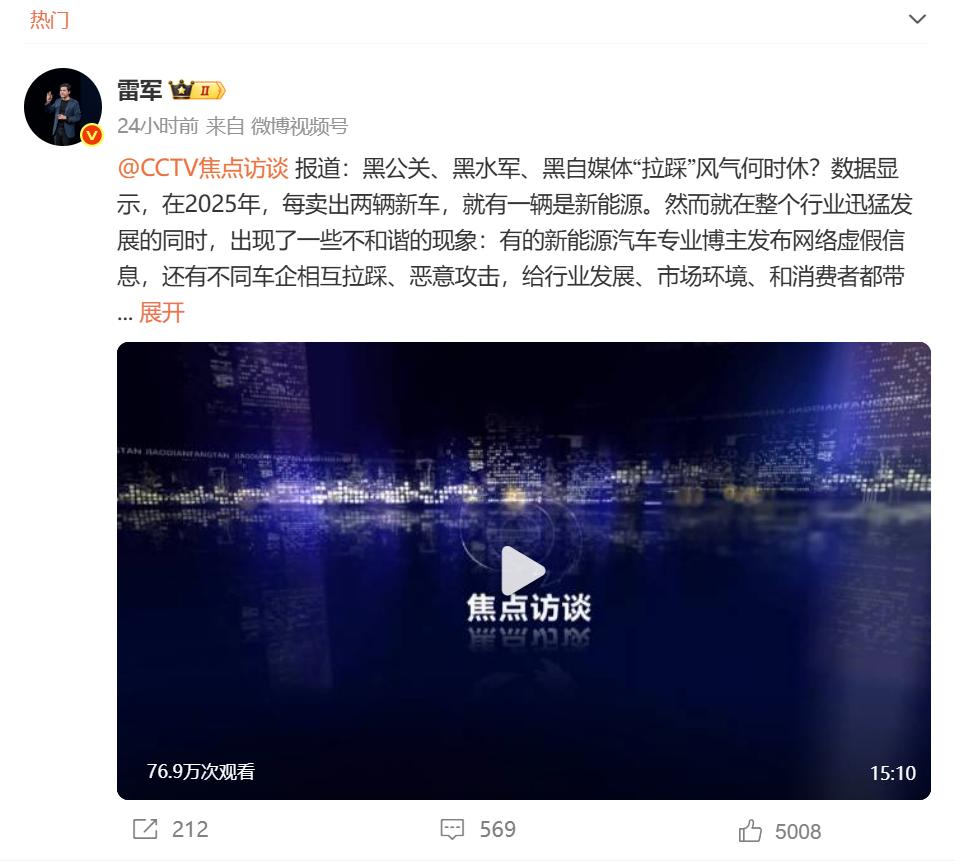 小米创始人雷军对这些乱象再次发声,黑公关、黑水军、黑自媒体“拉踩”风气何时休?更是指出数据显示,在2025年,每卖出两辆新车,就有一辆是新能源。然而就在整个行业迅猛发展的同时,出现了一些不和谐的现象:有的新能源汽车专业博主发布网络虚假信息,还有不同车企相互拉踩、恶意攻击,给行业发展、市场环境、和消费者都带来了巨大伤害。