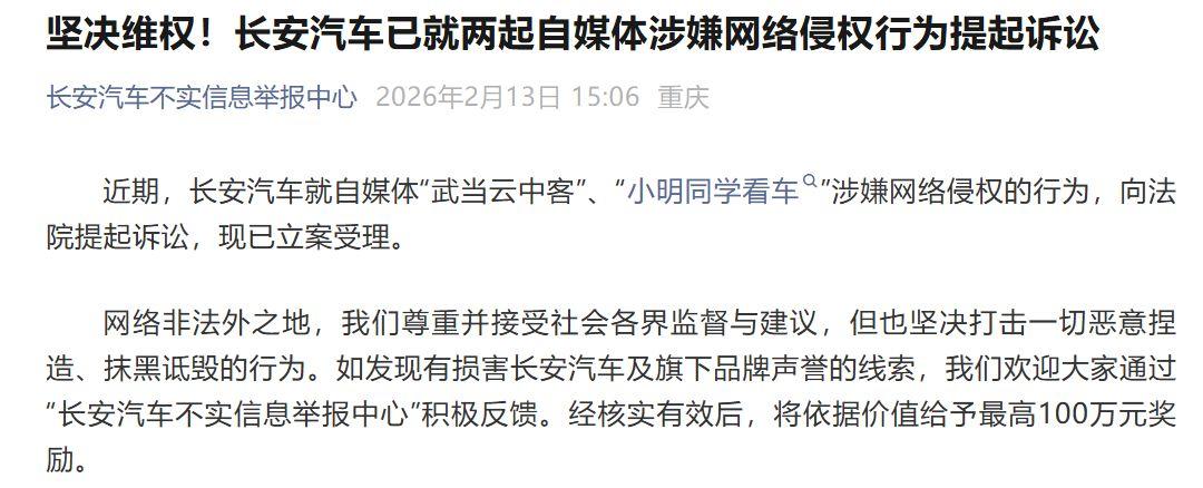 2月13日,长安汽车法务部发文称,就自媒体“武当云中客”“小明同学看车”涉嫌网络侵权一事向法院提起诉讼,目前该案已被法院立案受理。同时,官方表示网络非法外之地,尊重并接受社会各界监督与建议,但也坚决打击一切恶意捏造、抹黑诋毁的行为。如发现有损害长安汽车及旗下品牌声誉的线索,我们欢迎大家通过公众号“长安汽车不实信息举报中心”积极反馈。