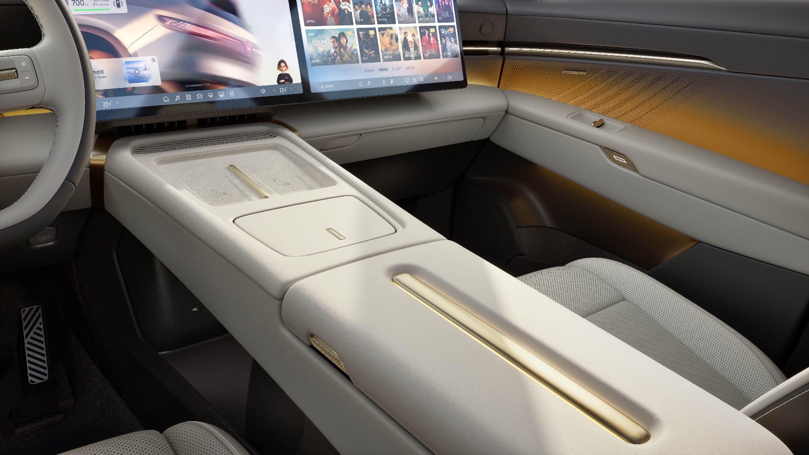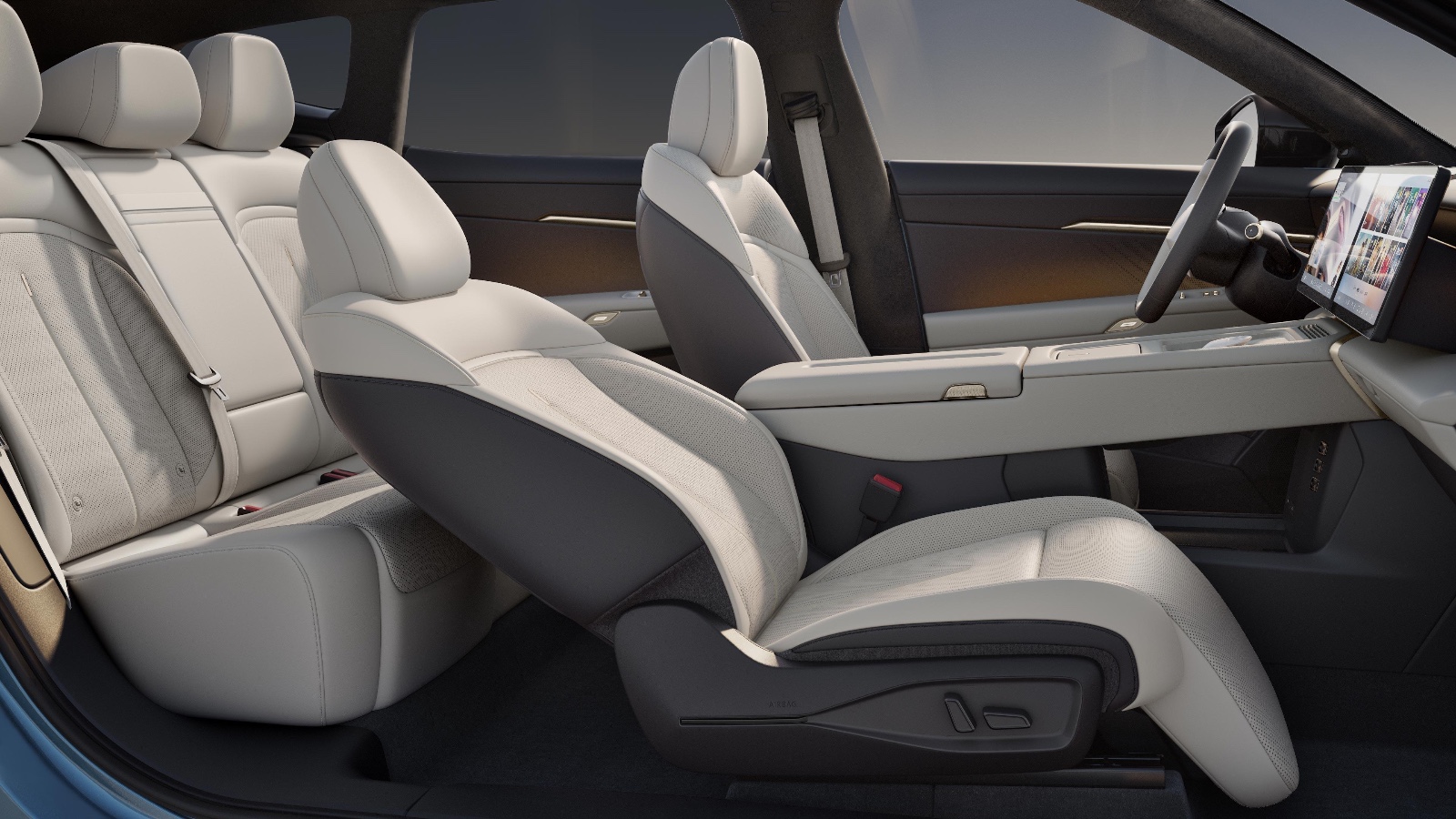 先来看看内饰设计部分,新车车内采用环抱式座舱设计,配备10.25英寸高清液晶仪表和双14.96英寸双联屏,支持导航、车况以及ADAS交互信息,双辐多功能方向盘采用实体按键与滚轮设计。此前,新车车顶还提供1.74㎡智能调光天幕等舒适性配置。座椅布局方面,新车采用五座布局,座椅均采用Nappa真皮设计,主驾座椅支持加热、通风与按摩功能;副驾座椅支持14向电动调节,配备电动腿托以及切换大床模式等,预计将会有不错的乘坐舒适感体验。