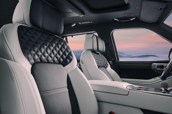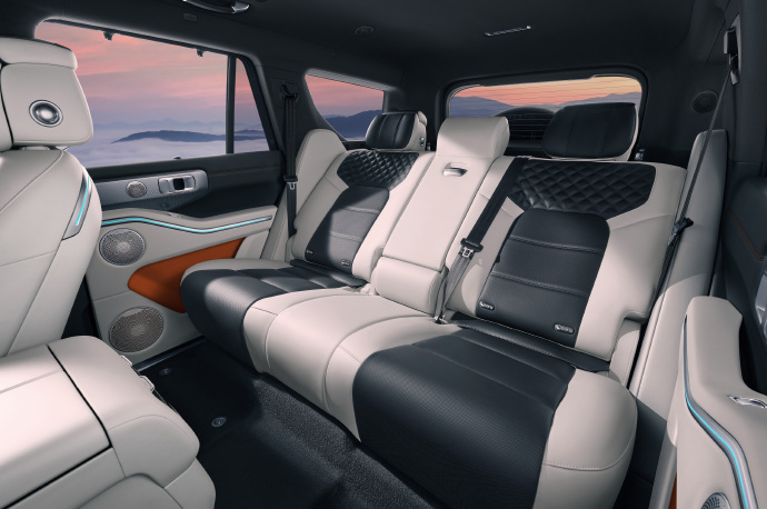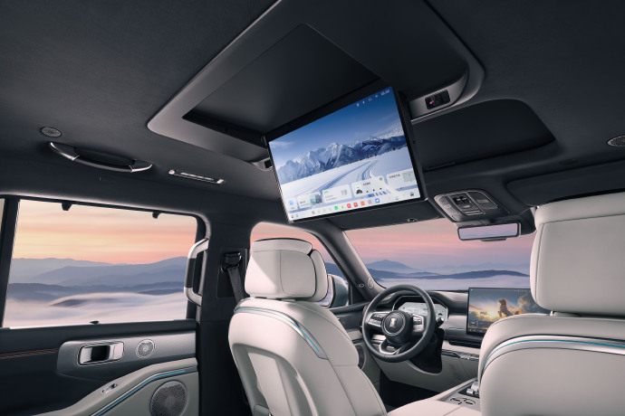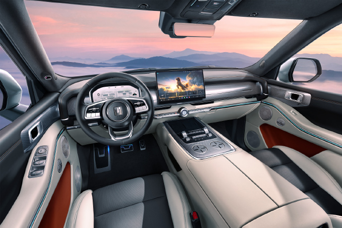 先来看看内饰设计,新车车内采用上深下浅配色方案,配备环抱式设计风格,整体看起来非常协调。车内提供三辐式多功能方向盘、全液晶仪表以及悬浮式大尺寸中控屏,并取消传统造型换挡杆,取而代之的是怀挡设计。此外,新车还在后排座椅配备可翻折吸顶屏、天窗、二排隐私帘,整体科技感十足。