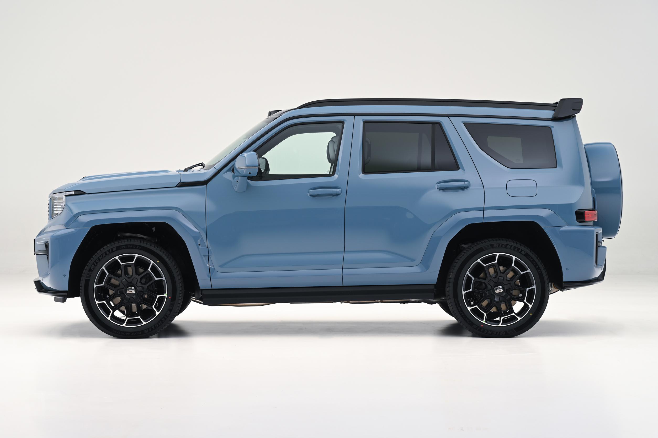 接着来看看外观设计,新车采用多边形窄条幅式格栅设计,格栅内部辅以蜂窝状元素,中央镶嵌坦克品牌LOGO,两侧配备分体式大灯组布局,点亮后拥有不错的辨识度。前包围则配备三段式进气口,搭配带有通风开口的前发动机舱盖,展现出不错的科技感。车身侧面,新车采用硬派越野设计风格,越野车气息浓郁。尺寸方面,新车长宽高分别为5105/2061/1985mm,轴距为3000mm。值得一提的是,新车新增车顶激光雷达,外后视镜和后保险杠提供辅助驾驶小蓝灯。车尾部分,新车尾灯同样采用分体式大灯组设计,搭配造型夸张的扰流板以及大尺寸外挂式备胎设计,令车辆看起来拥有不错的运动感。另外,新车尾门采用侧开式布局。
