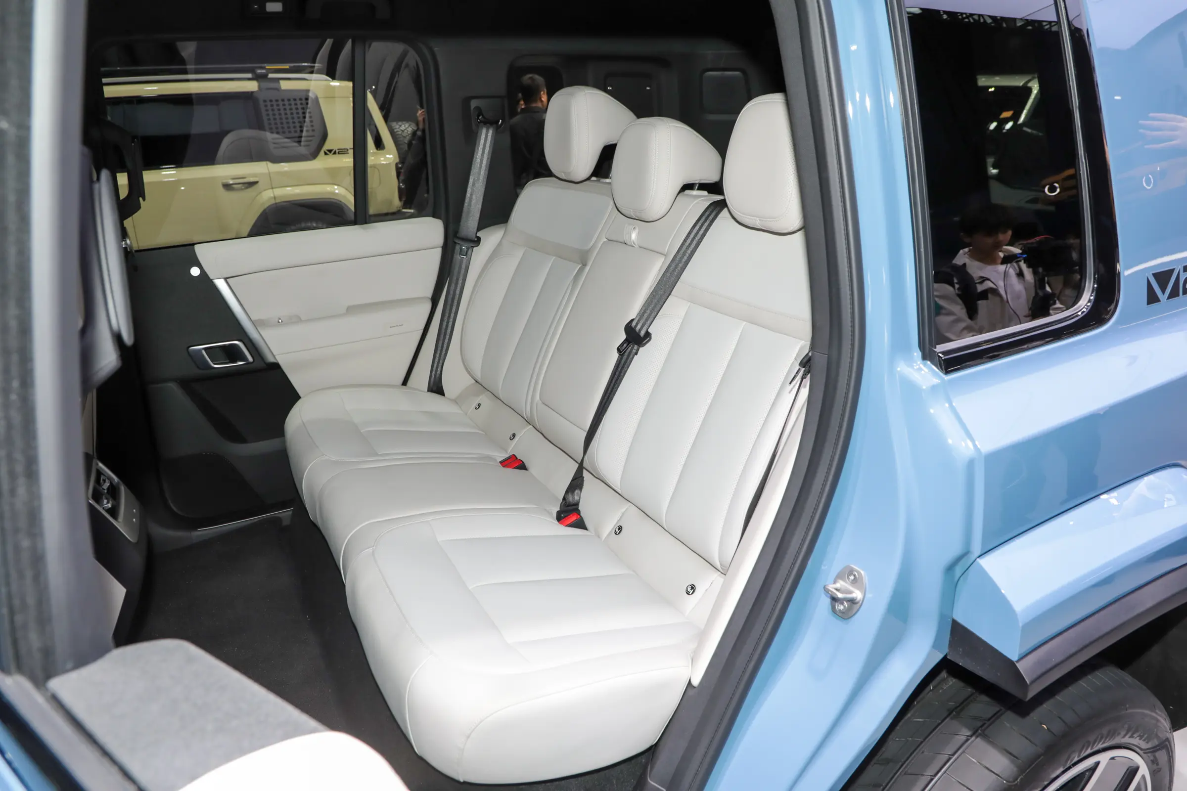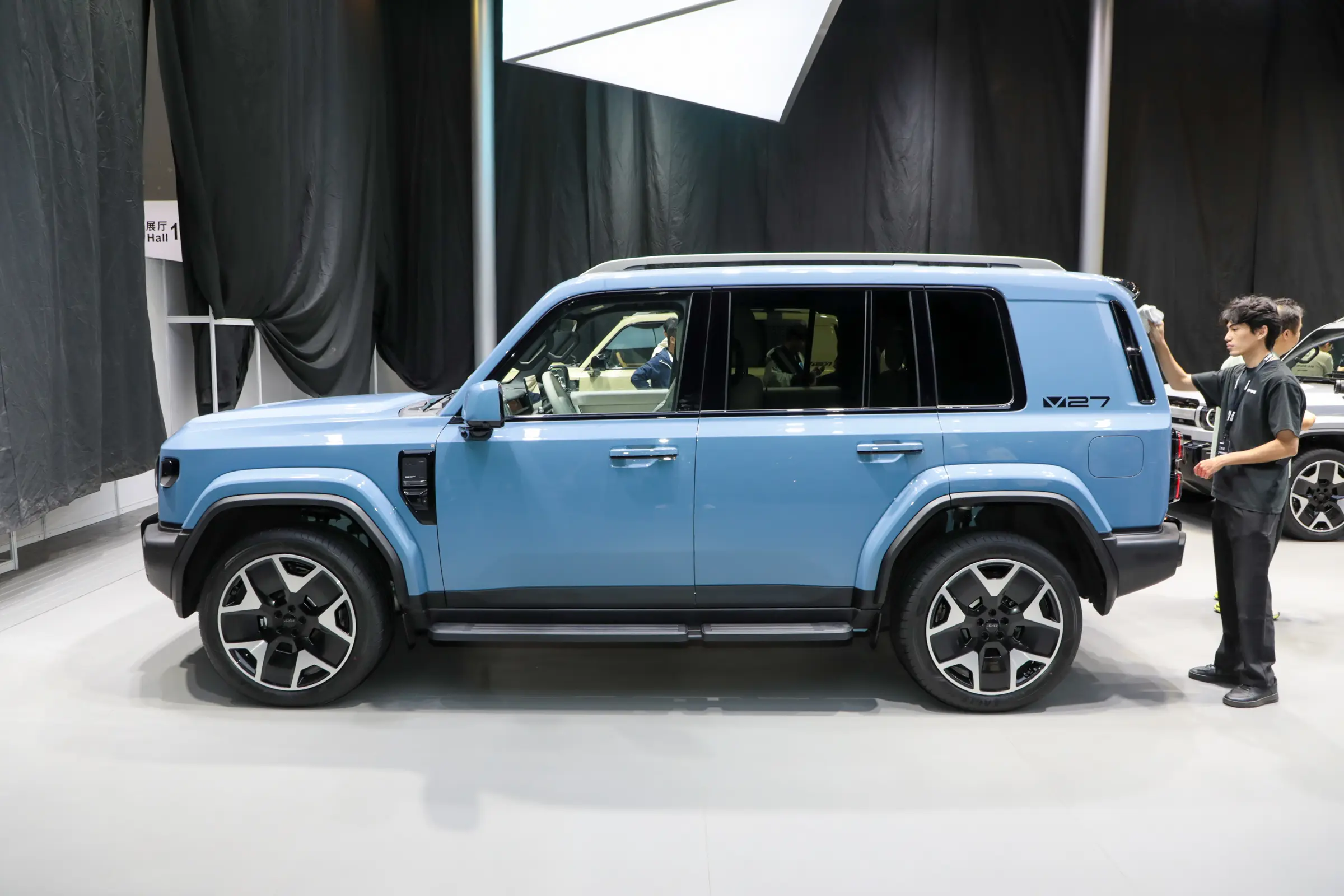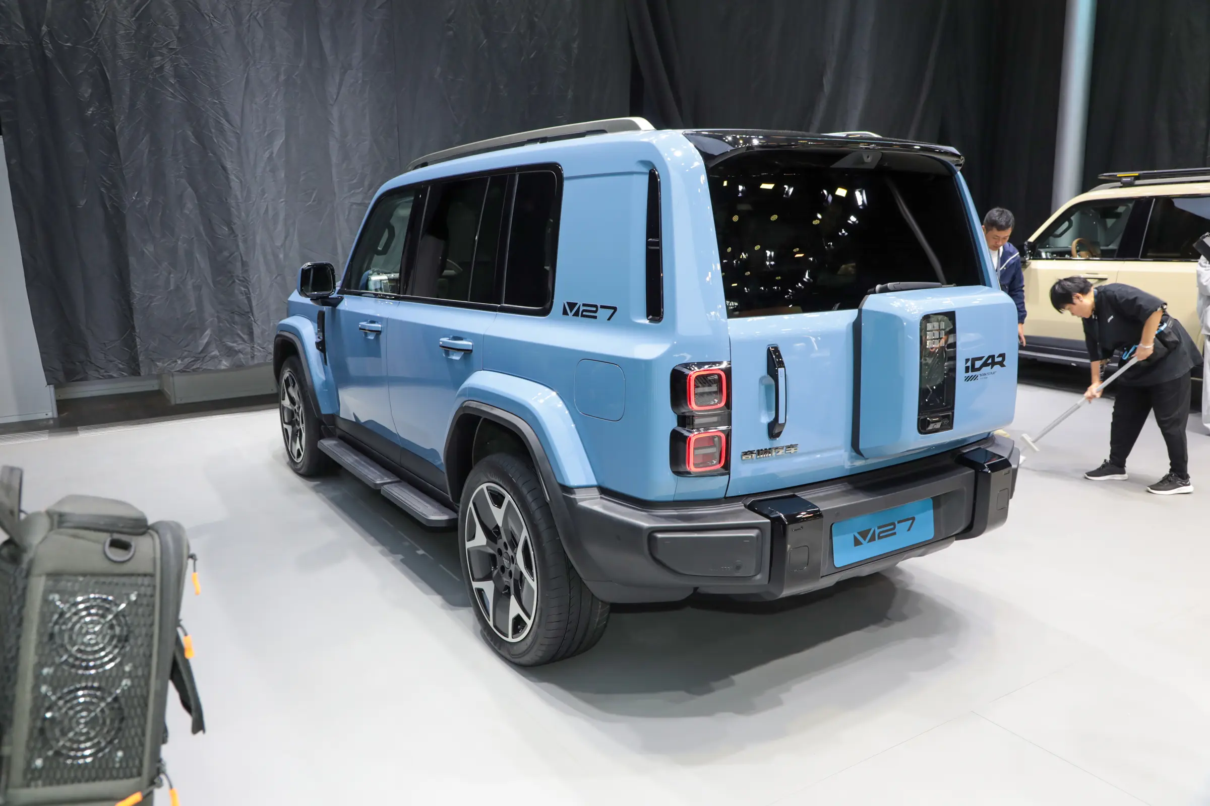 车身侧面,iCAR V27采用趋于平直的车顶线条,配合车身腰线以及隆起的轮眉,配备左右分体式天窗、传统造型车门外拉手、运动造型五辐轮辋、固定式踏板等,从而营造出较为硬朗的视觉效果。新车前翼子板处带有黑色装饰件,内部或融合侧后向摄像头。尺寸方面,新车长宽高分别为5055/1976/1894mm,轴距2910mm。车尾部分,新车采用纵向尾灯组,配备外挂式备胎、车顶扰流板等,尾门采用侧开的方式。