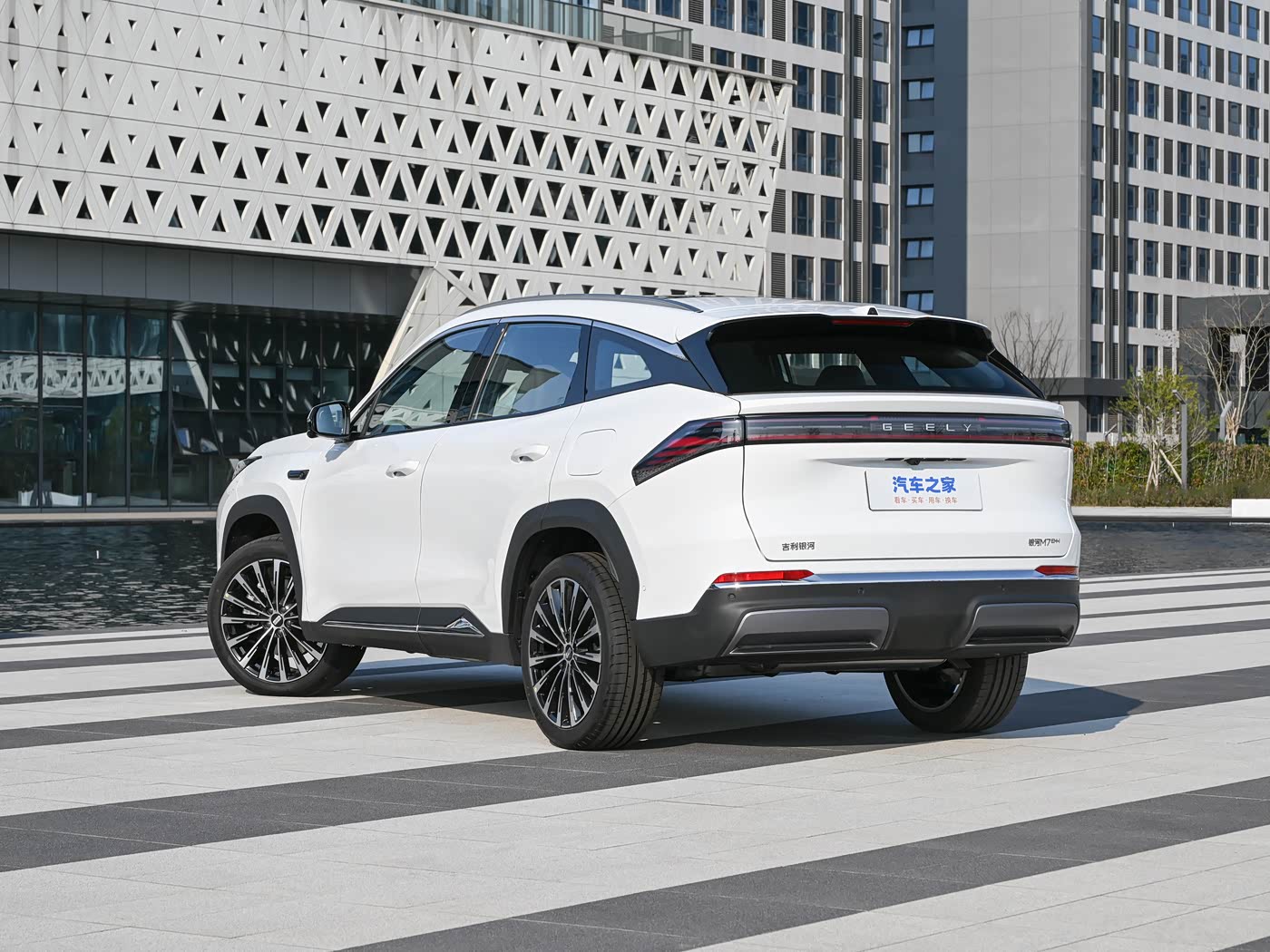 车身侧面,银河M7采用传统样式车门把手,并针对前后轮眉加入黑色哑光塑料饰板,搭配密辐式轮圈以及窗框镀铬饰条,提升车辆精致感。尺寸方面,长宽高分别为4770/1905/1685mm,轴距为2785mm,定位紧凑型SUV。车尾部分,新车采用贯穿式尾灯组,中央则为吉利品牌英文标识,搭配造型别致的扩散器以及车顶扰流板,有着不错的运动感。