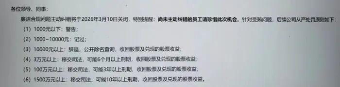 根据网传截图信息,零跑汽车发布主题为“关于廉洁合规问题主动纠错的通知”,其中提到,公司将设立为期一个月的主动纠错窗口期,在此期间,凡主动将过往违规所得上交至公司廉洁账户的员工,其涉及的过往违规行为将被既往不咎、予以免责。通知还提到,这并非纵容,而是为曾经犯错且愿意改正的员工提供“放下包袱、重新出发”的机会,希望大家主动纠错,悬崖勒马。申报时间为期30天,截至3月10日。3月10日后,尚未主动纠错的行为将会受到处罚。处罚力度按金额区分为6档,最轻的为“1000元以下:警告”,最高的为“1500 万元以上:移交司法,可能10年以上刑期,收回股票及兑现的股票收益。”