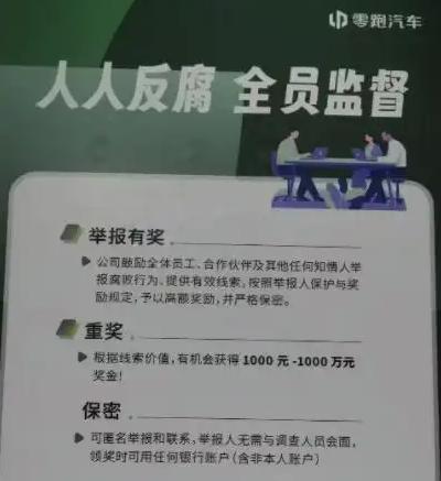 与此同时,零跑汽车也对内发布反腐举报奖励,鼓励员工、合作伙伴和其他任何知情人举报腐败行为、提供有效线索,根据线索价值有机会奖励1000元至1000万元奖金。