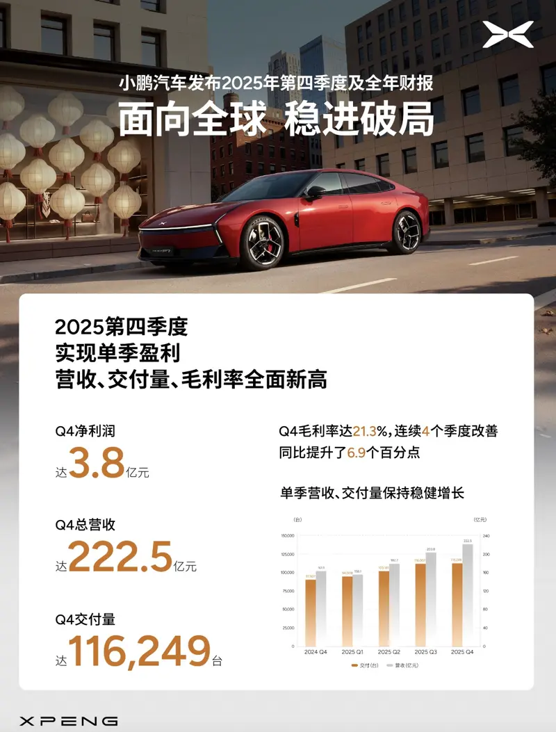 值得一提的是,除了汽车布局外,小鹏汽车还在飞行汽车、Robotaxi 及人形机器人等领域均有展开深入的布局。得益于旗下车型销量的增长,小鹏汽车在去年实现了毛利率增长。数据显示:去年小鹏汽车营收为767.2亿元,同比增长87.7%;净利润为亏损11.4亿元,同比收窄80.3%;毛利率为18.9%,同比提升4.6个百分点。销量方面,去年小鹏汽车累计交付429445辆新车,同比增长125.9%。