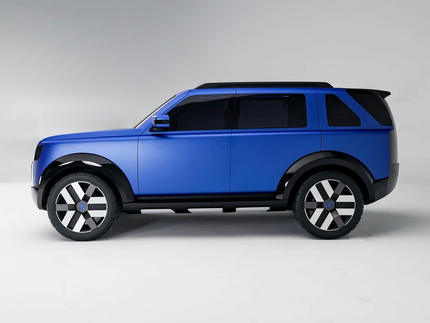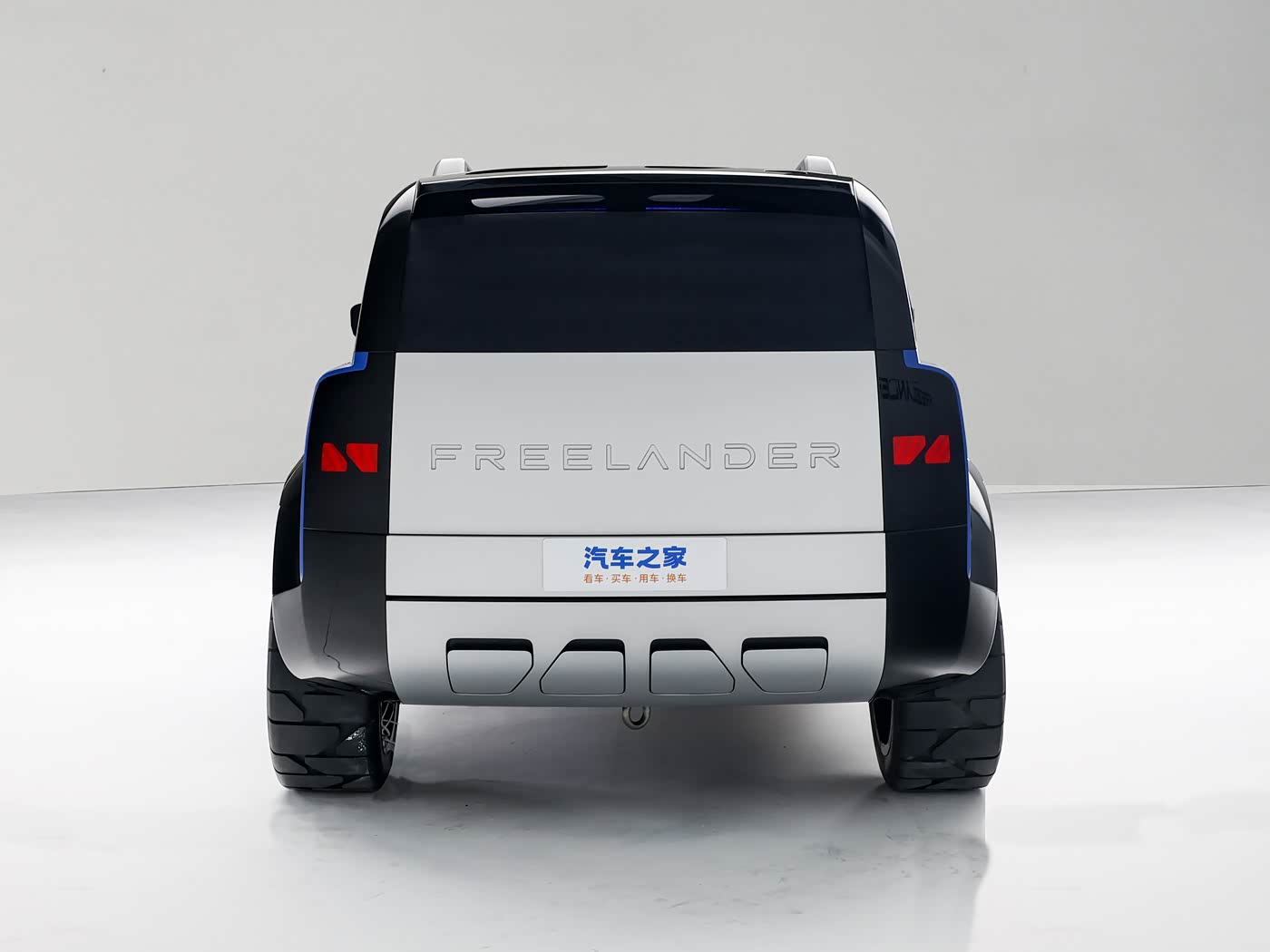 车身侧面,神行者Concept 97车身下半部与上半部车窗呈现阶梯式腰线的视觉结构,黑色轮拱与侧踏板均为外扩式造型,多色轮辋中央的矩形标识为FREELANDER神行者的图形车标。车尾部分,神行者Concept 97采用近乎垂直的尾部线条,带有上窄下宽的“硬派肩线”,两侧纵置尾灯点亮后与头灯一样拥有品牌图形几何像素模块,支持智能交互。新车车顶带有镂空式后扰流设计,尾门中央同样是“FREELANDER”字母车标,下包围造型与前包围相呼应。