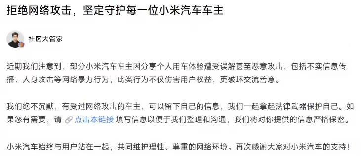 对于网络攻击小米车主的行为,官方指出长期以来,针对小米品牌及用户的恶意侵权行为时有发生,此类行为既损害用户合法权益,也破坏健康有序的社会环境。小米法务部始终坚持 “零容忍” 态度,坚决配合有关部门政策,依法依规推进维权工作,严厉打击一切侵权行为。此外,还提醒广大小米车主,若遭遇网络攻击或线下恶意破坏事件,可通过小米汽车社区拒绝网络攻击入口,提交相关证据。