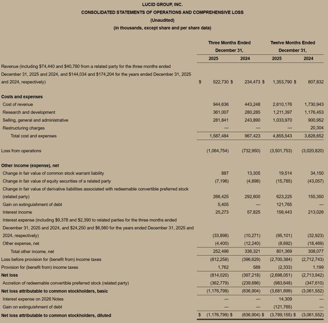 目前,Lucid共推出了Lucid Air和Lucid Gravity两款车型,其中Lucid Air定位豪华纯电动轿车,Lucid Gravity定位纯电动SUV车型。数据显示,去年Lucid交付量为15841辆新车,同比增长55%。值得一提的是,虽然Lucid的销量在去年实现了增长,但依旧没能逃脱亏损的局面。去年Lucid营收为13.54亿美元,运营亏损为35亿美元,净亏损为27亿美元。截至2025年12月31日,Lucid的总资产为83.87亿美元,负债为53.86亿美元。