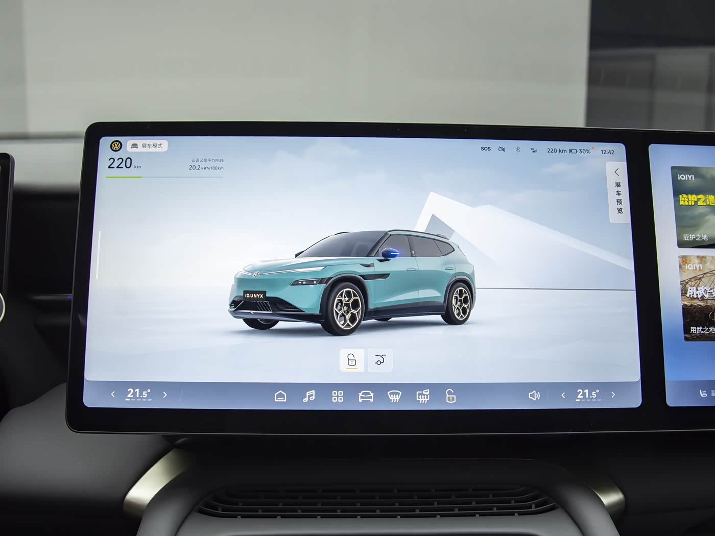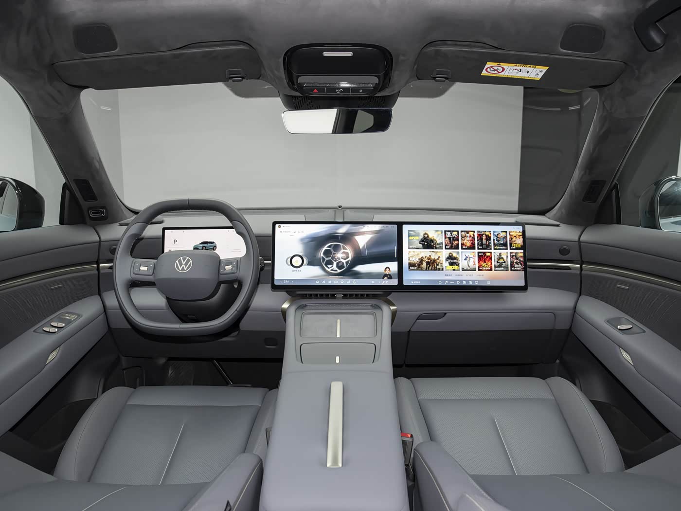 内饰方面,与众08内饰整体采用较为居家的设计风格,环抱式座舱搭配10.25英寸高清液晶仪表+双14.96英寸双联屏,让其符合当下新能源车型的主流配置以及审美。双辐多功能方向盘回归实体按键与滚轮设计,中央处具有金色可发光大众车标。整车座椅采用Nappa真皮,副驾座椅提供14向电动调节配合腿托。同时,车辆还将提供10点气动按摩、柔光化妆镜。车辆二排提供折叠桌板、主/副驾座椅靠背磁吸接口、靠背10°可调,提供座椅加热、隐私玻璃、中央扶手杯托。此外,车顶提供1.74㎡智能调光天幕,搭载20扬声器音响系统,支持7.1.4声道。