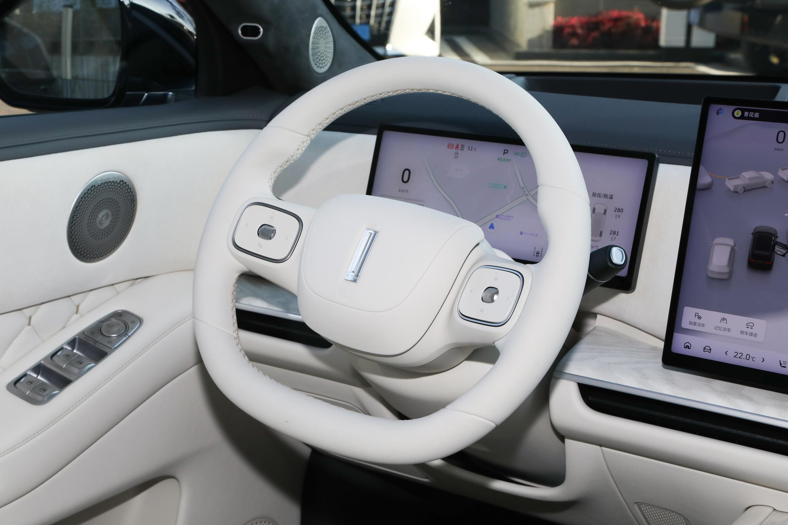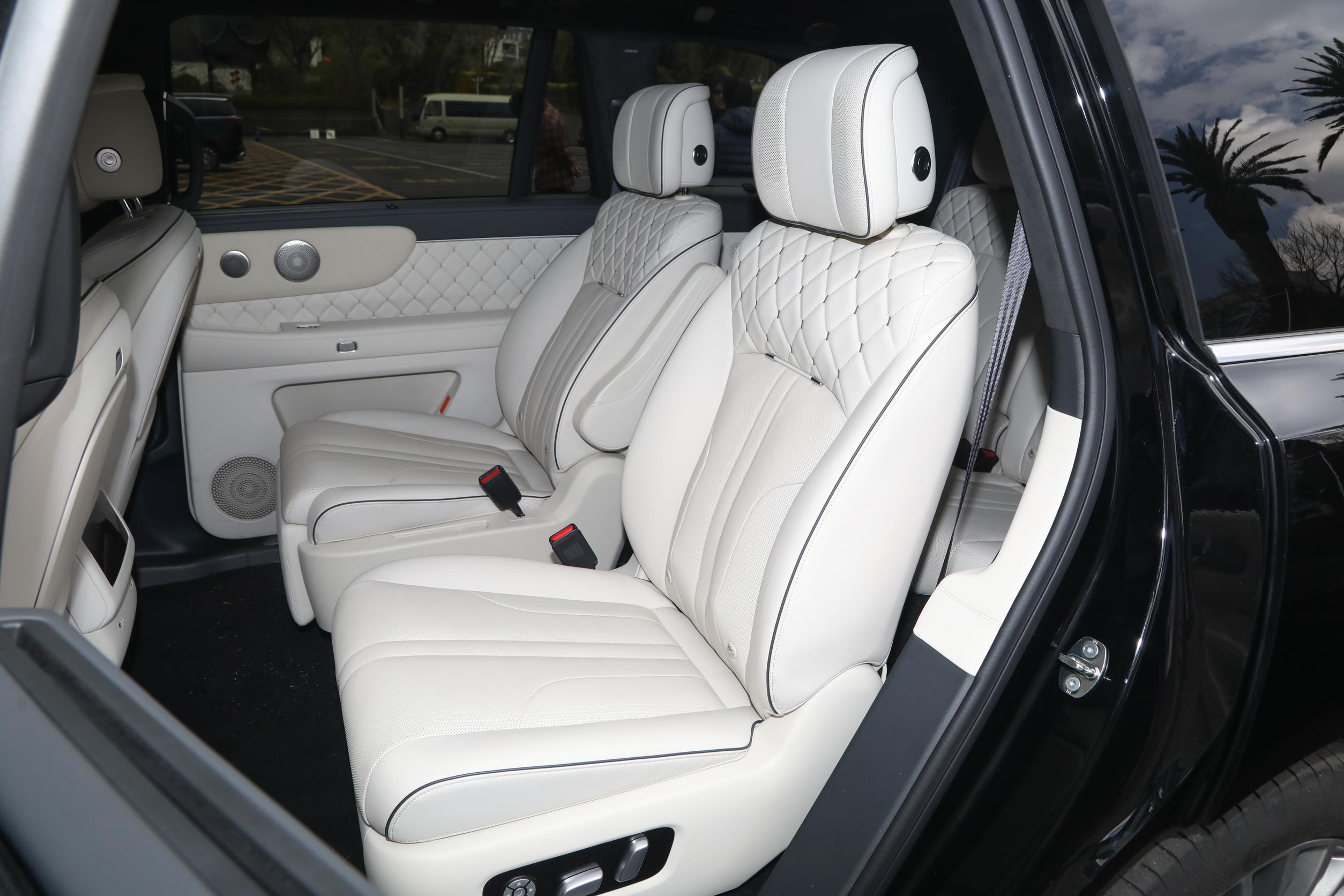 外观设计,新车前脸采用封闭式格栅搭配星环式贯穿式灯带设计,灯带支持流水迎宾效果,灯组中央镶嵌了可发光的悬浮立体车标设计,点亮后辨识度非常高。前包围中央采用主动闭合式进气格栅,车顶顶部提供激光雷达,预计将搭载高阶驾驶辅助系统。车身侧面,新车线条平直硬朗,采用双腰线和双拼色车身设计,配备常规造型的双拼色门把手,并提供21英寸轮辋,整体运动感十足。车尾部分,新车采用矩阵叠影尾灯设计,超红光630nm波长LED尾灯,两侧呈现出椭圆形形状,点亮后辨识度较高。排气方面,新车采用隐藏式排气布局,尾部牌照安装区位于后保险杠之上。另外,新车还集成辅助驾驶小蓝灯。