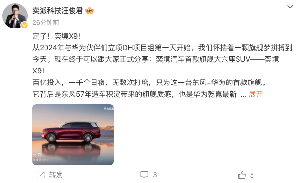 4月20日,奕境汽车正式官宣,旗下首款旗舰大六座SUV定名——奕境X9。东风奕派汽车科技公司总经理汪俊君在微博上还发布了一张关于新车图片。汪俊君表示,新车将在4月23日开幕的华为乾崑生态技术大会上首次亮相,并在4月24日开幕的北京车展完成展出。