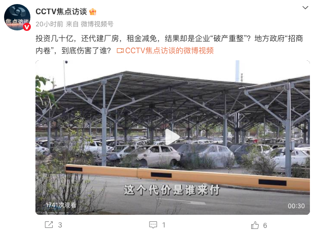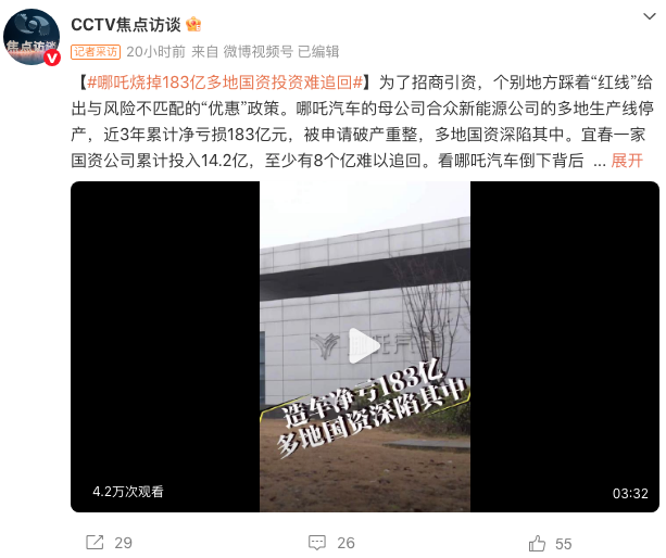 报道称,为了招商引资,个别地方踩着“红线”给出与风险不匹配的“优惠”政策。早期,为了让新能源汽车项目快速落地宜春,当地投资股权、代建厂房、提供十年租金减免,甚至每辆在宜春出售的汽车政府还奖励2万元,但很多优惠条件违反或变相违反了相关政策法规,让人触目惊心。哪吒汽车在招商引资过程中,国资委等投资近20亿元用于收购哪吒汽车的股权,但随着合众新能源被申请破产重整,这些投资打了水漂,至少有8亿元国资投入难以追回。据央视报道,2021年至2023年三年期间,合众新能源累计净亏183亿元,平均每卖一辆车就亏8万多,哪吒汽车也从新势力“黑马”沦为破产重整企业。