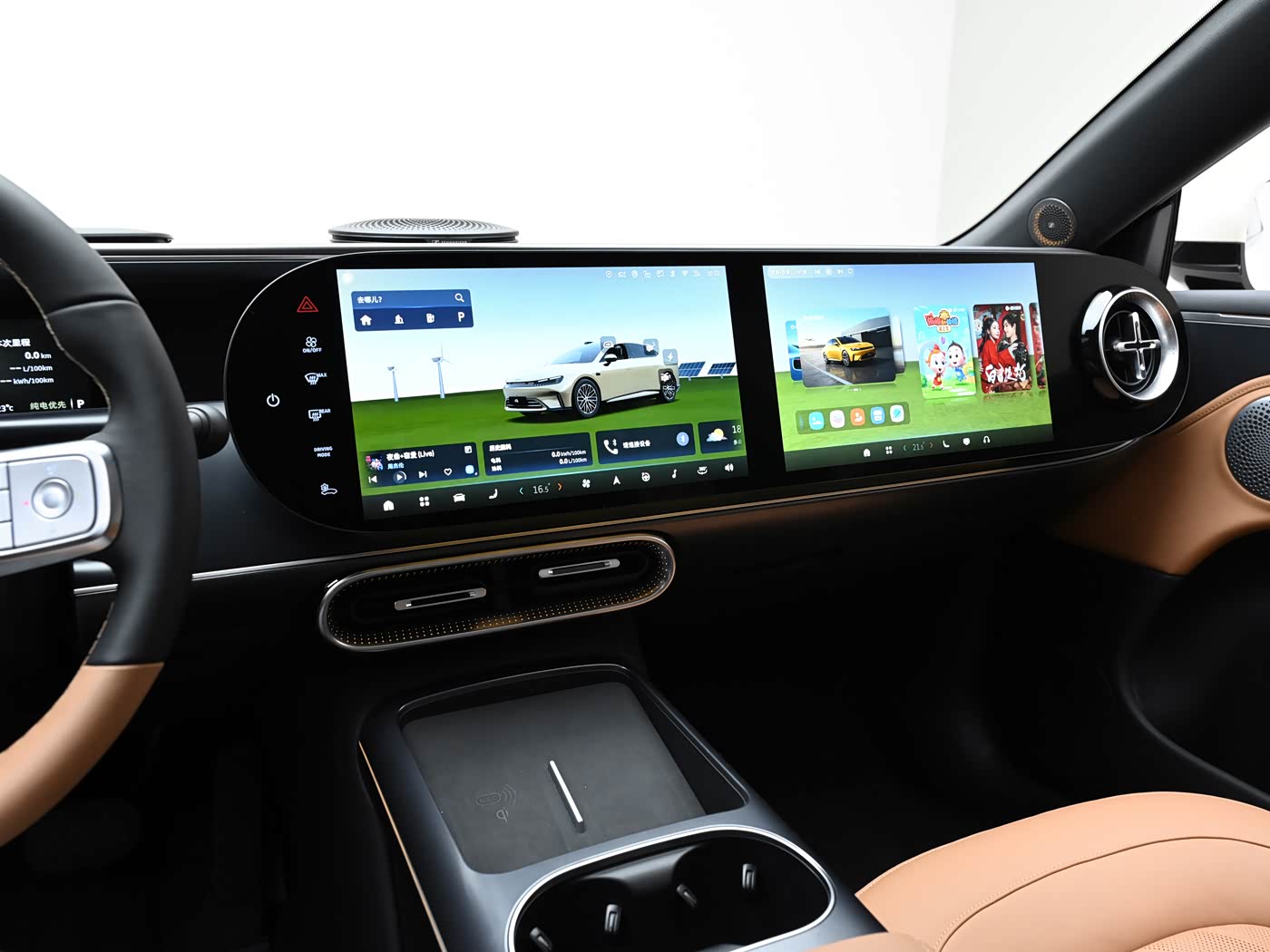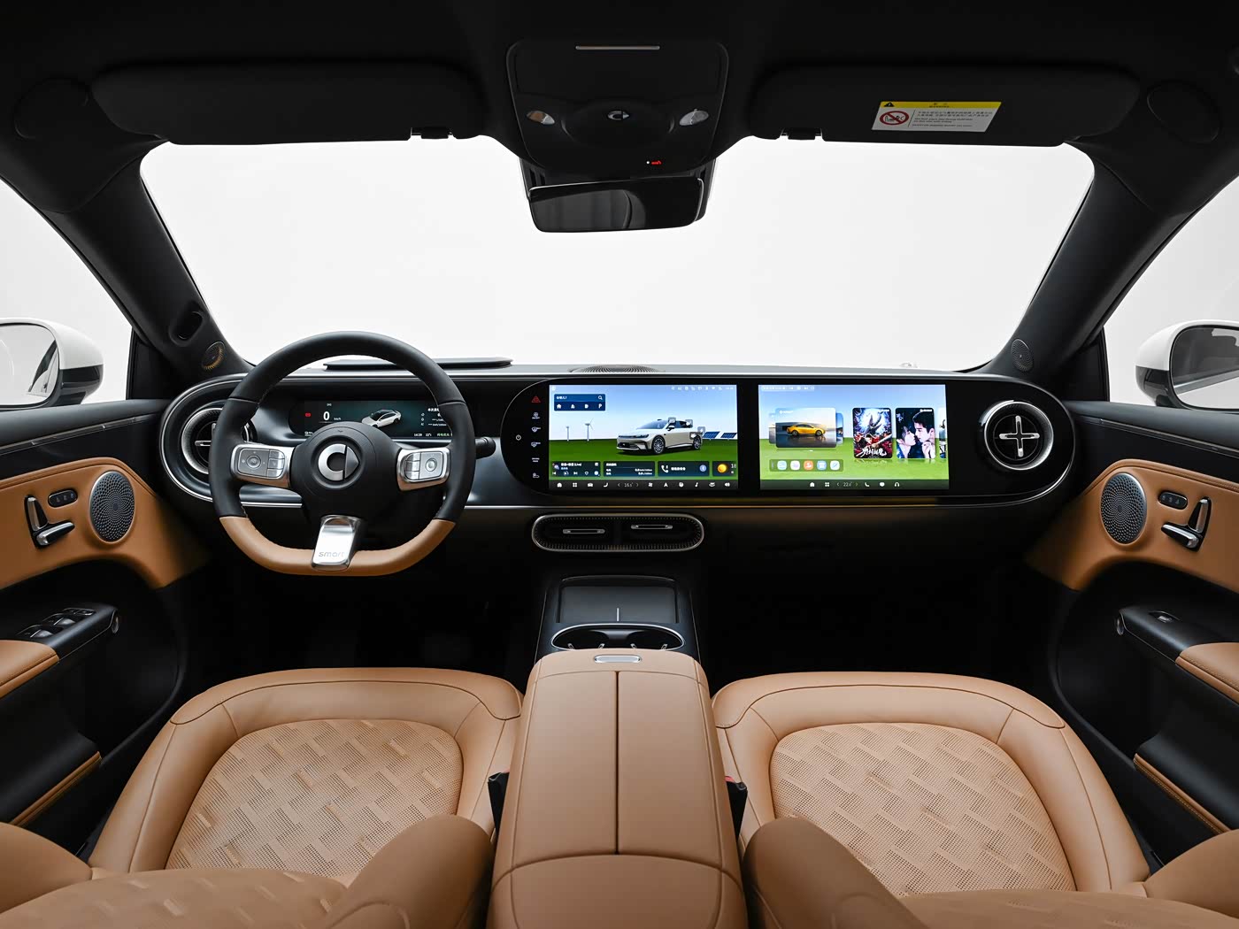 内饰来看,smart精灵#6 EHD提供格律黄、玄影黑和原野棕三种内饰配色选择。中控台采用整体贯穿式的中控台造型,包含内嵌式矩形全液晶仪表盘,以及中控屏+副驾娱乐屏的双联屏设计,并且双联屏的边框还采用家族式胶囊设计元素。车门面板上将会有千鸟格图案点缀,空调出风口则采用圆形+十字扇叶的组合,类似于飞机涡轮造型。此外,新车中控台中央配备可升降扬声器,同时中岛区域带有手机无线充电面板以及横置的开放式杯架,车内配备近800处灯光点位,26处氛围灯支持256色自定义。