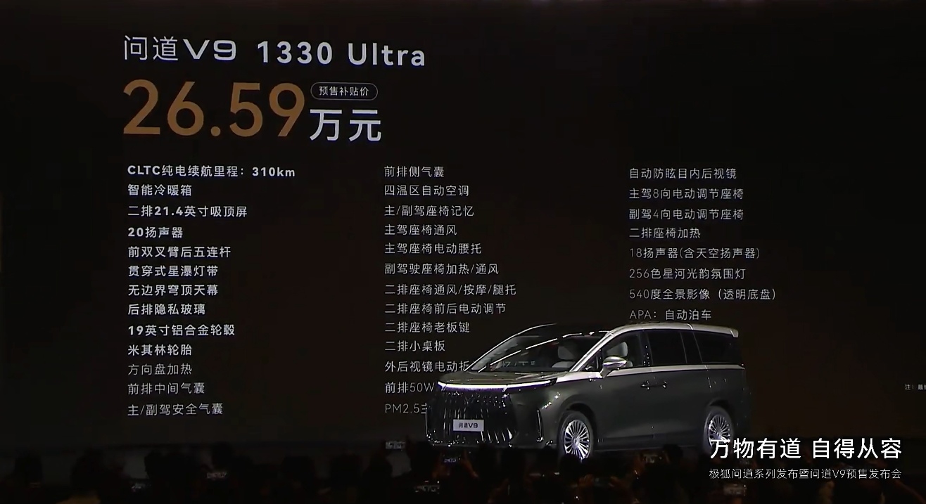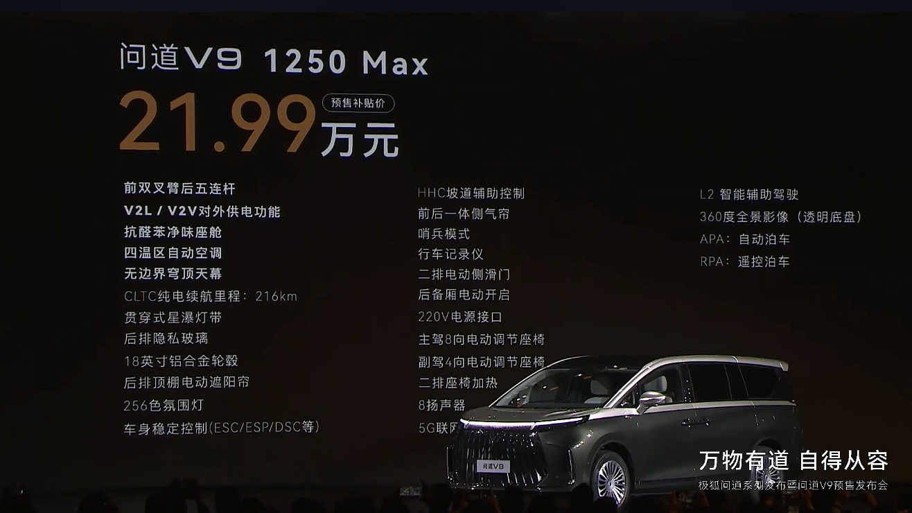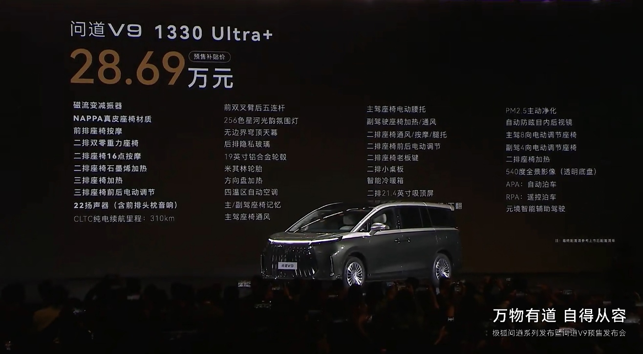 4月28日,极狐汽车旗下高端产品系列“问道”首款高端MPV——问道V9正式开启预售。新车共推出4款车型,预售价格为21.99-28.69万元。