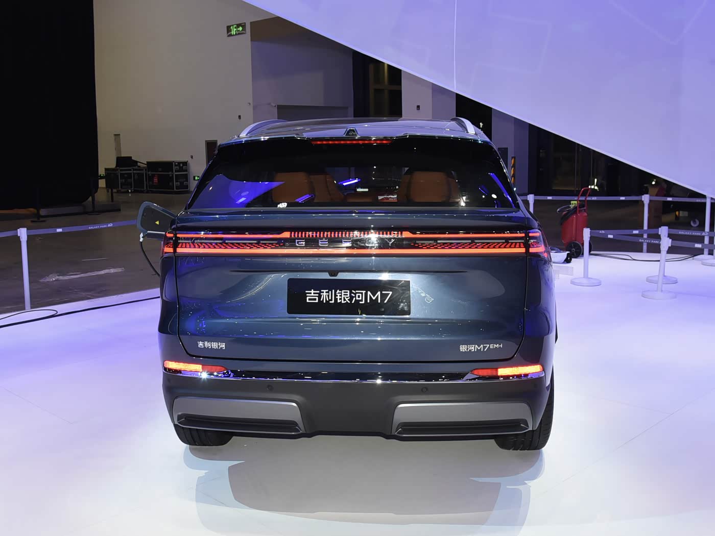 车身侧面,银河M7则在采用传统样式车门把手,并针对前后轮眉加入黑色哑光塑料饰板,搭配密辐式轮圈以及窗框镀铬饰条,提升车辆精致感。尺寸方面,长宽高分别为4770/1905/1685mm,轴距为2785mm,定位紧凑型SUV,轴距与银河L7看齐,但尺寸比银河L7、星舰7都大。车尾部分,新车采用贯穿式尾灯组,搭配344颗超红光LED的“旭日东升”尾灯,后包围采用双段式扩散器装饰。