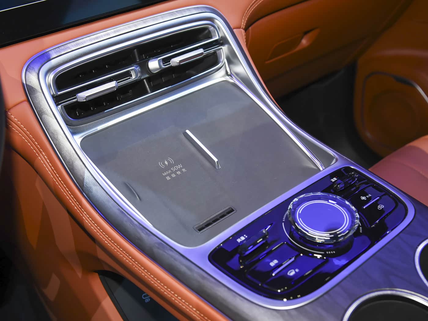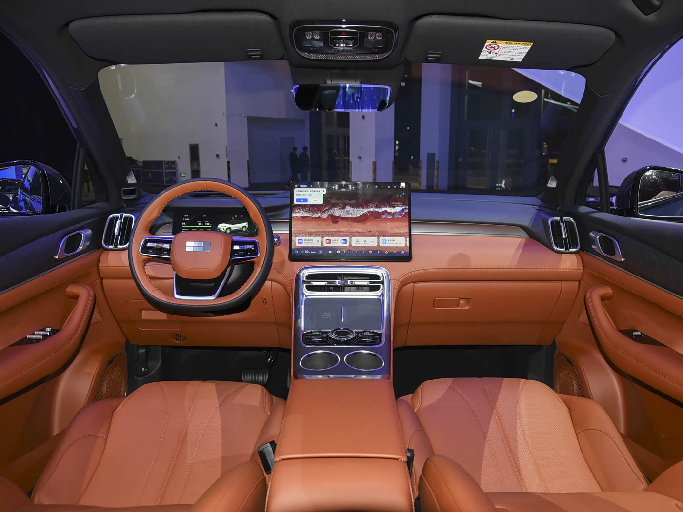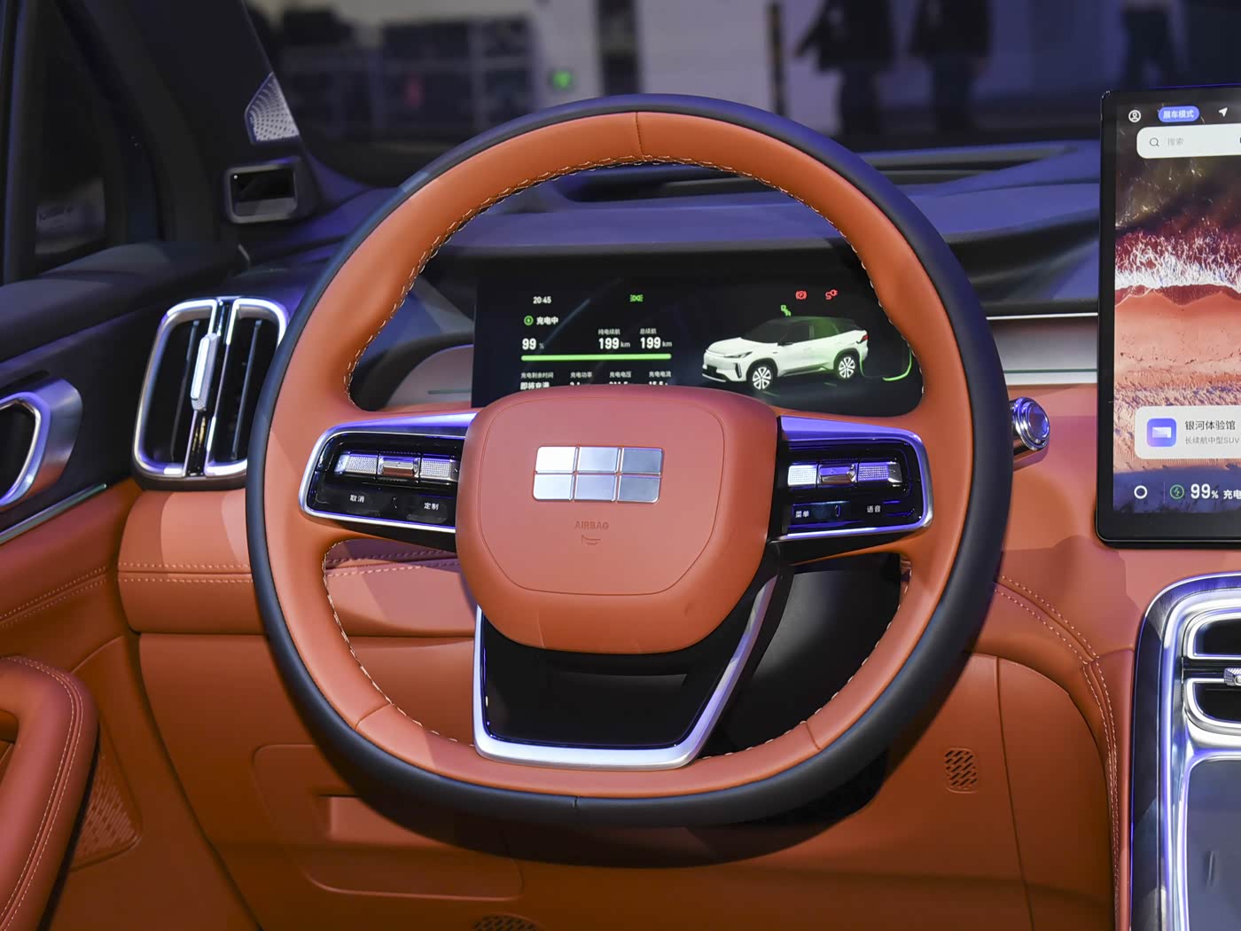 内饰方面,银河M7基本延续了星舰7 EM-i的设计风格,中控台加入大量的木质纹理,并提供大面积的软质包裹营造出高级感,提供观山灰、观山灰翻毛皮版、栖霞橙、静湖白三种内饰配色。银河M7中控台采双色设计,仍然采用15.4英寸2.5K中控屏,配备Flyme Auto 2智能座舱,内置7nm龙鹰一号芯片,中央下方的物理控制按键与水晶组件得到保留,引入全新的25.6英寸AR-HUD抬头显示以及更大尺寸的全液晶仪表,还有更具高级感的全新双色三辐多功能方向盘。