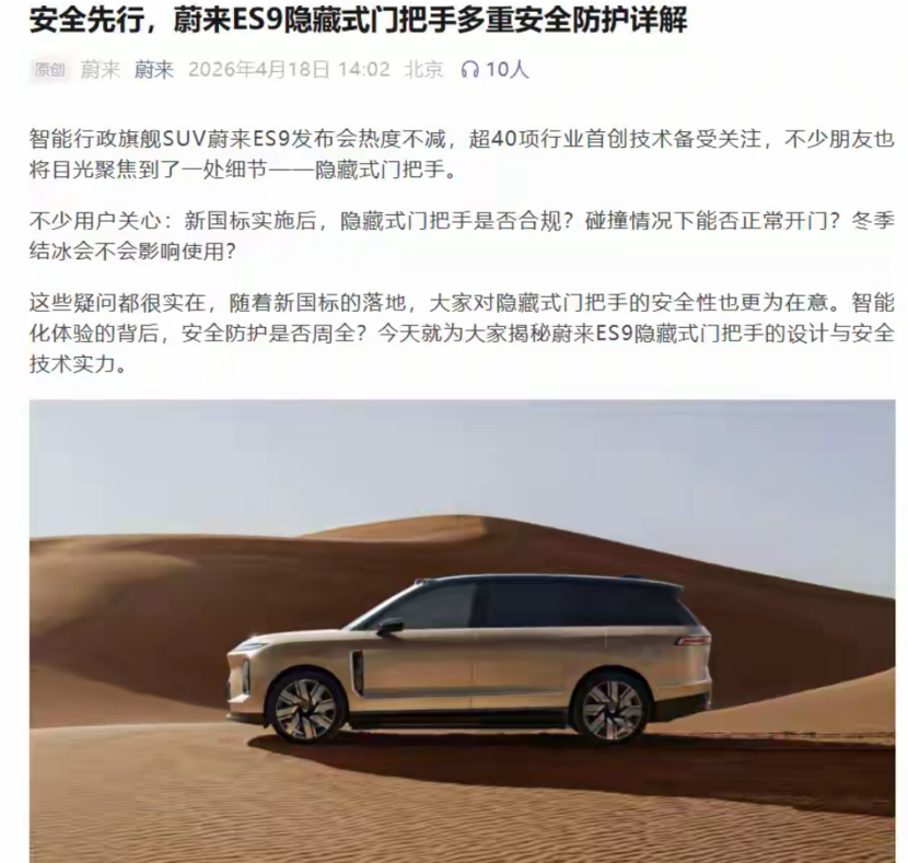 4月18日,蔚来汽车发文回应ES9仍用隐藏式门把手一事。官方表示,目前蔚来全系在售车型,均可以正常使用隐藏式门把手,也完全合规。对于“禁止隐藏式把手”的条目,新国标的实施时间要求:2027年12月31