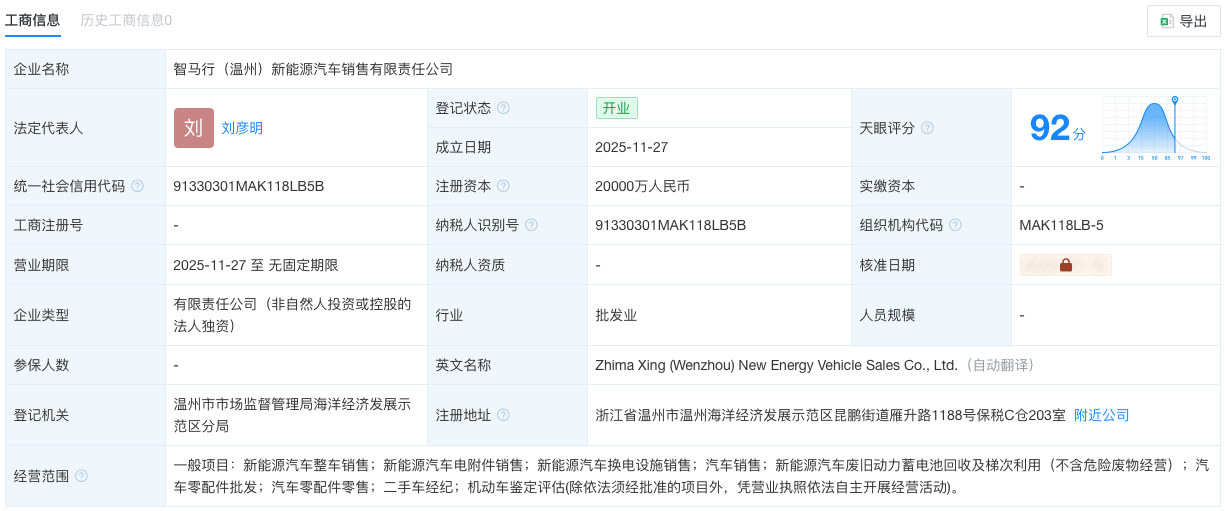 天眼查信息显示,11月27日,智马行(温州)新能源汽车销售有限责任公司成立,该公司位于浙江省温州市,法定代表人为刘彦明,注册资本为2亿人民币,是一家以从事批发业为主的企业,经营范围包括新能源汽车整车销