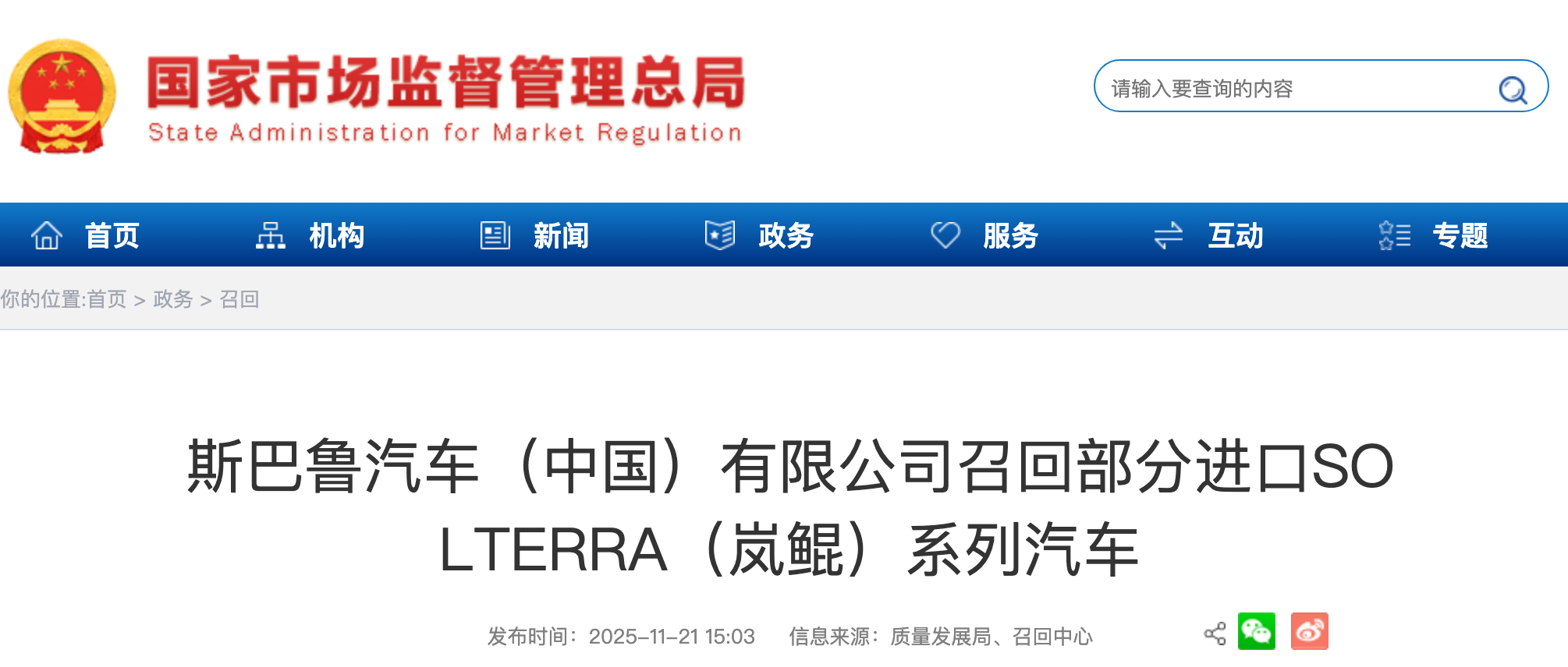 11月21日,国家市场监督管理总局发布公告,斯巴鲁汽车(中国)有限公司根据《缺陷汽车产品召回管理条例》和《缺陷汽车产品召回管理条例实施办法》的要求,向国家市场监督管理总局备案了召回计划。公告显示,斯巴